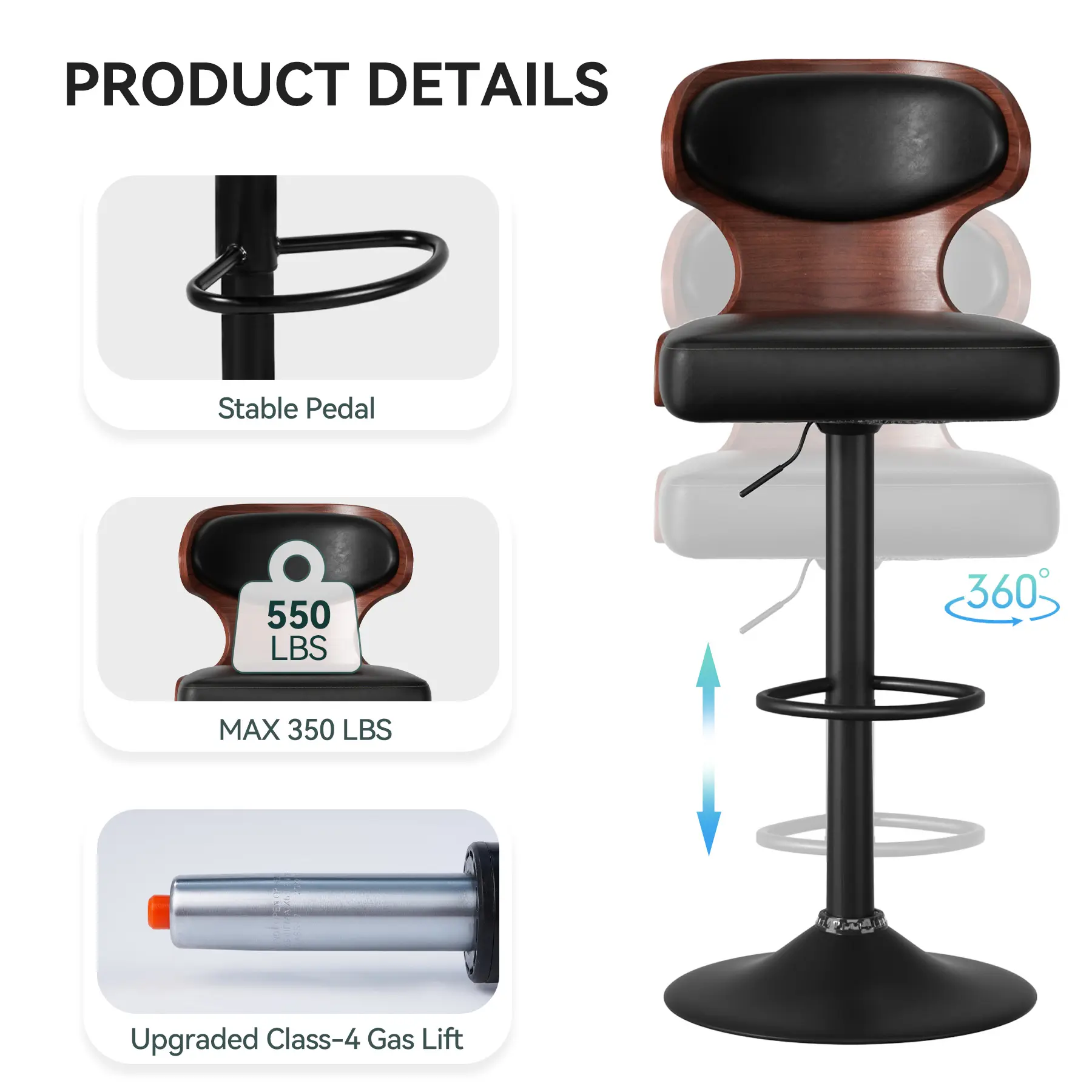 ·Sturdy and Reliable: Built to last, these bar stools feature a firm and wide base that provides exceptional stability and support. The anti-scratch rubber ring on the bottom protects your floors while ensuring slip resistance, adding to their durability. Rest assured, these stools can handle up to 550 lbs, making them suitable for various individuals.