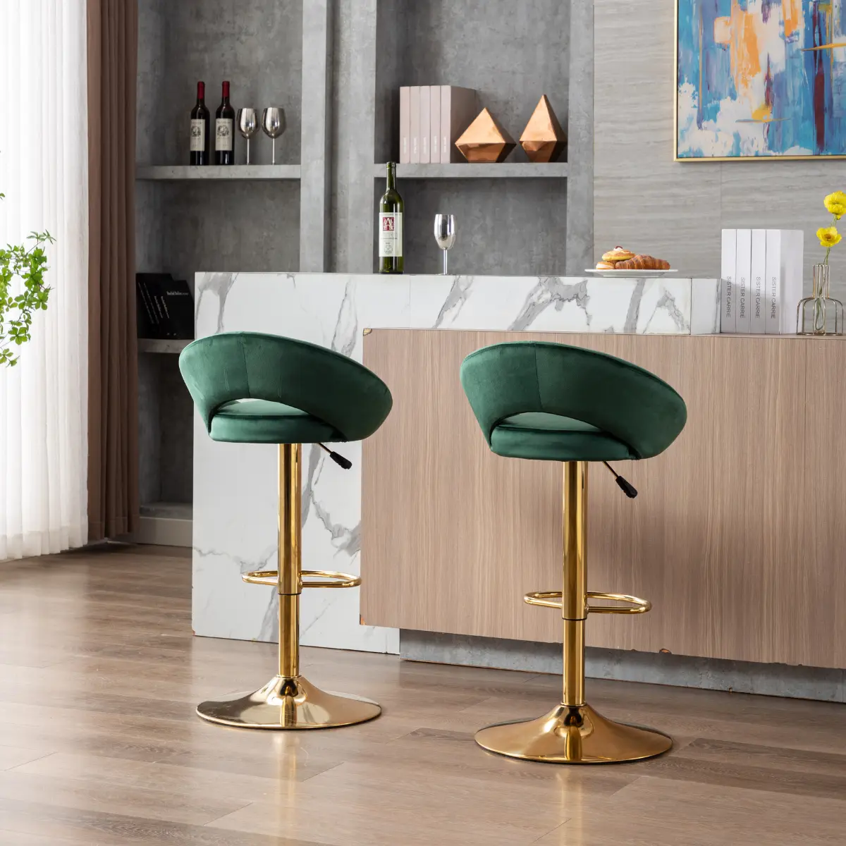 【MODERN DESIGN】Contemporary counter height barstools that looks minimalist but magically blends into almost any decor. Gold finish metal legs, green velvet open back, a luxurious sense helps you create your lovely sweet home. Won't you expect compliments from your guests?