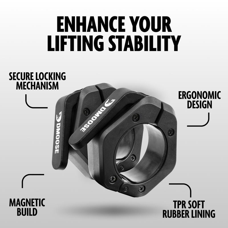 Upgrade your workouts with the DMoose Barbell Clamps and experience the benefits of a more secure and efficient workout. With its innovative magnetic design and secure locking mechanism, these clamps are the perfect addition to any workout routine.