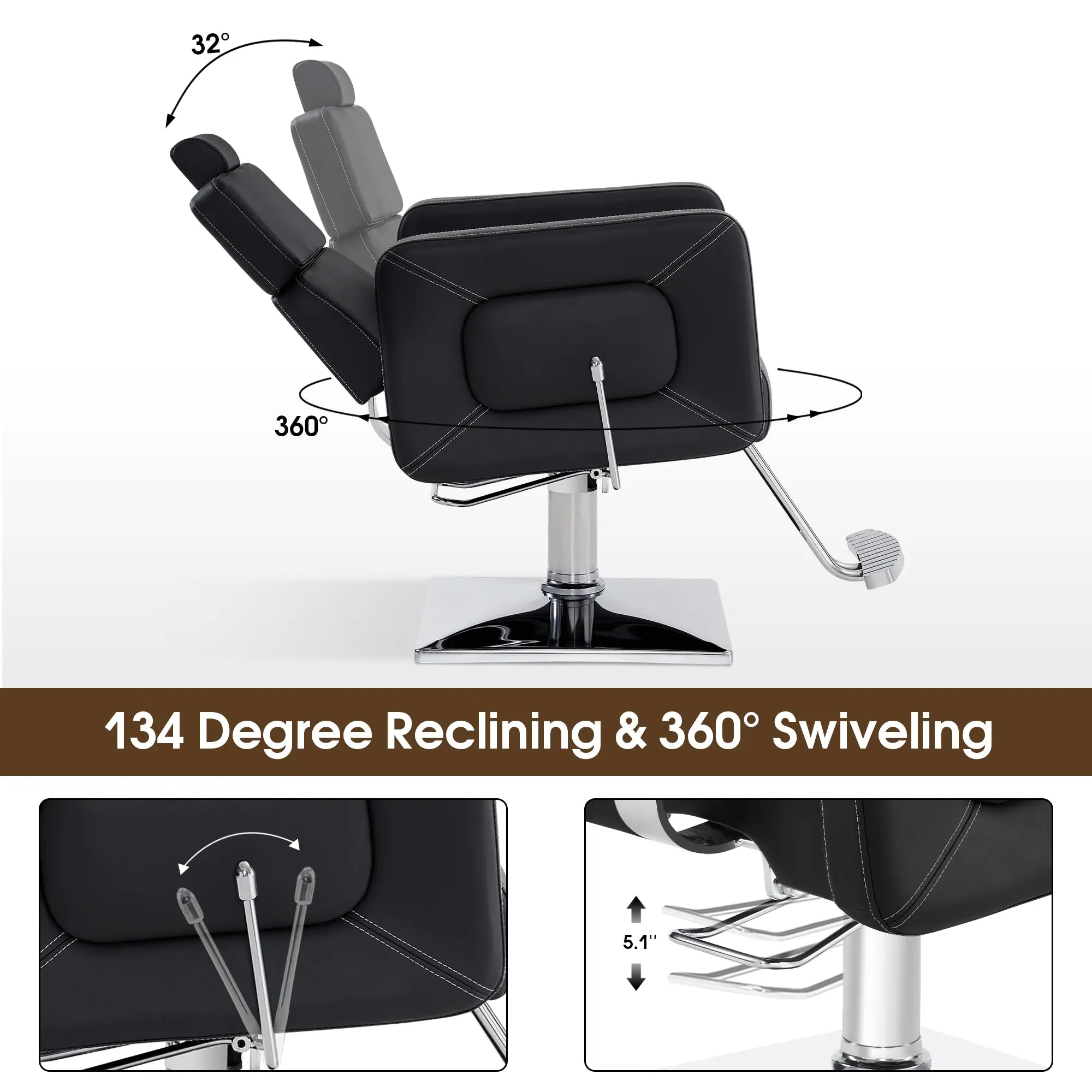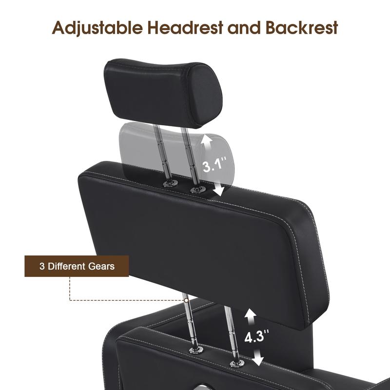 ·Versatile & Adjustable: Reclining backrest (up to 134°), detachable headrest, and adjustable height (up to 5.1”) for various uses like haircuts, eyelash extensions, and facials.