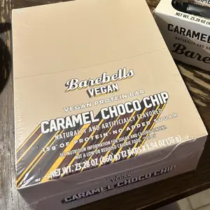 ·BAREBELLS PLANT BASED CARAMEL CHOCO CHIP PROTEIN BAR – A box of 12 crave-worthy bars that taste more like a treat than a protein bar. This flavor features a soft, cookie dough-inspired center, sprinkled with chocolate chips, a layer of caramel sauce - all wrapped in a velvety chocolate coating. Each bar delivers 15g of plant-based protein from soy, peas, and rice—with *no added sugar, no palm oil, and just 210 calories per bar.