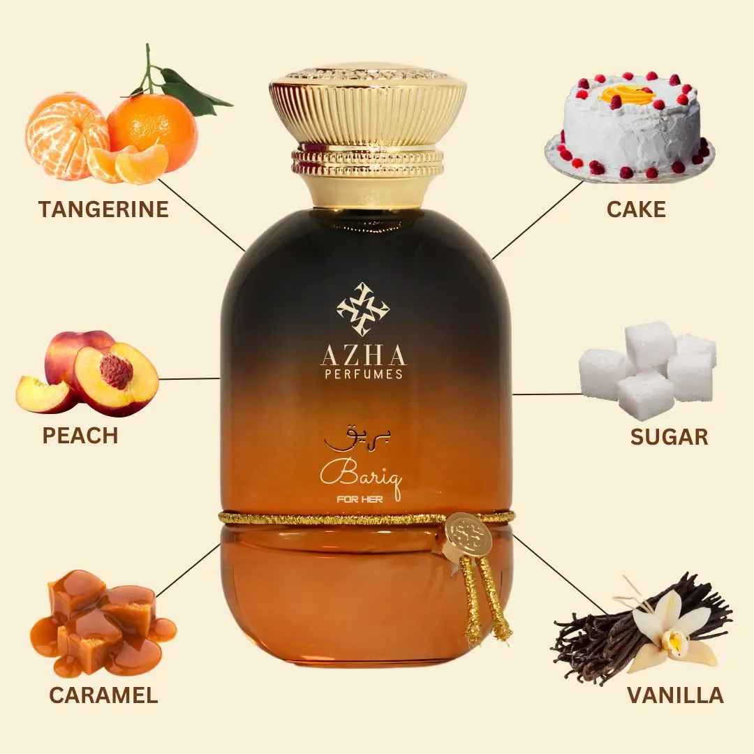 Bariq, from the Essence Orbis Collection, opens with a bright medley of tangerine, orange, and lemon, sweetened by the comforting note of cake for a deliciously uplifting start. The heart blooms with jasmine and orange blossom, softened by juicy peach and a dusting of sugar, adding a playful, gourmand charm.