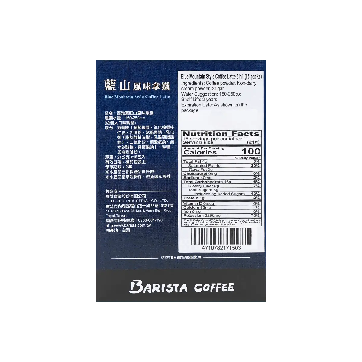 5. Barista Coffee Blue Mountain Flavor Latte - 15 Sachets (21g Each) - Taiwanese Premium Instant Coffee Mix