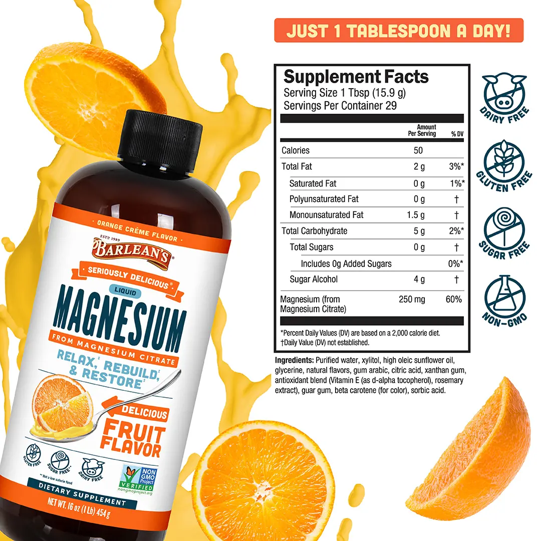 ·TASTE THE FRUIT, NOT THE MINERALS: Barlean’s Seriously Delicious Liquid Magnesium turns your daily magnesium supplement into a smooth, creamy orange cream experience. No pills to swallow and no chalky powders - just a delicious liquid magnesium that makes daily nutrition something you actually look forward to