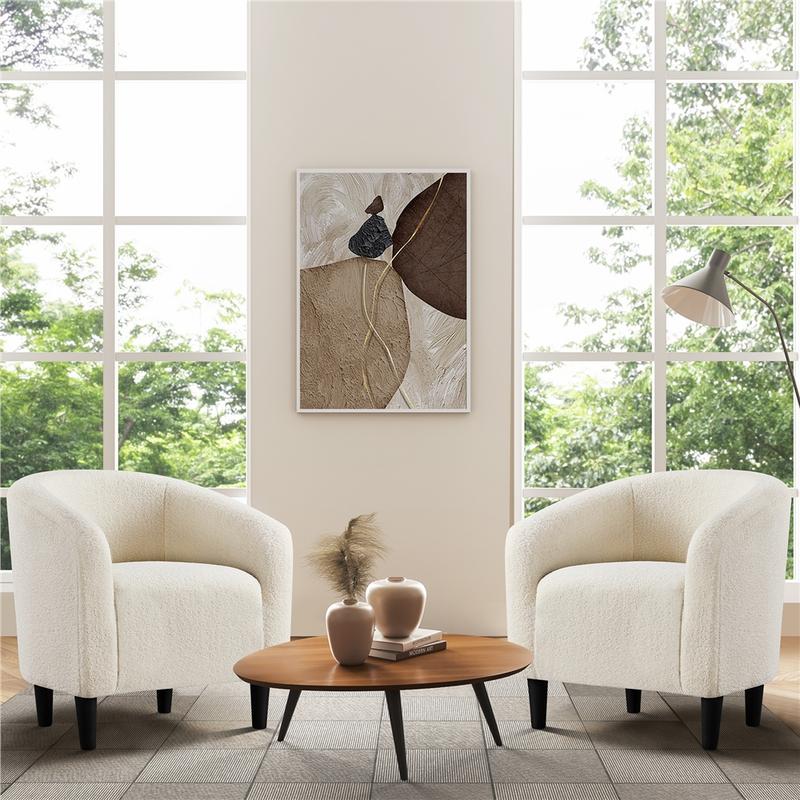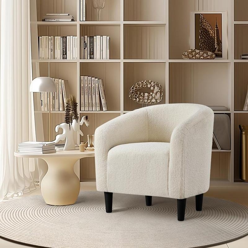 The blend of clean-lined silhouette and traditional curved design creates an elegant look for this boucle club chair, making it a welcoming addition to any seating area. Constructed of a manufactured wood frame, soft-to-touch boucle covering and medium-firm foam seat, this barrel chair stands out from others for its quality and comfort. The ability to hold up to 300lb provides a strong and durable seat for all ages. The curved back and armrest introduce soft lines to your space and the chair offers a nice-looking spot to kick back and relax in the living room, study, or for commercial use in the café, hotel and suchlike.