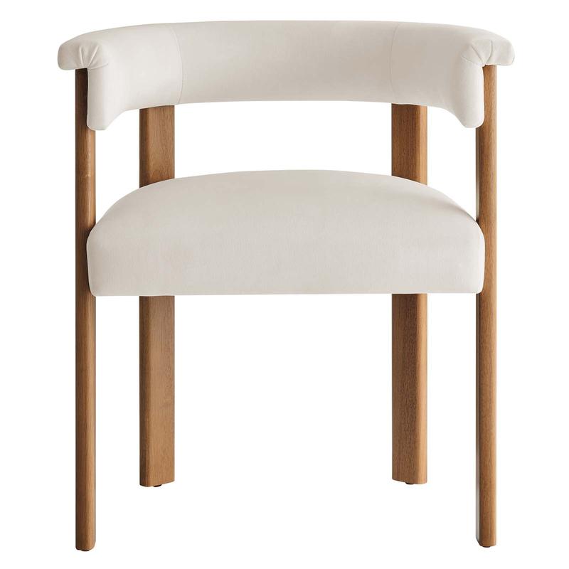 Feel the exquisite combination of modern chic and ultimate comfort with the Imogen Performance Velvet Dining Chair Set of 2. These contemporary dining chairs feature a unique barrel back silhouette that cradles you in luxury with its curved backrest and open design, offering both support and style. The foundation of each dining room armchair is built on sturdy wood legs, for durability and strength to accompany its aesthetic appeal. The seats and backrests, constructed from high-quality plywood, are enveloped in a dense layer of foam and stain-resistant performance velvet upholstery, creating an inviting look that beckons you to sit and relax well after you've finished eating. The fixed seat and cushion provide a seamless, clean look that complements any dining table with grace. These curved back dining chairs are equipped with non-marking plastic foot pins, protecting your flooring. Perfectly suited as a velvet accent chair or part of your kitchen & dining room ensemble, this set of two rounded back dining chairs seamlessly integrates with a variety of decor themes, from modern farmhouse to contemporary and minimalist aesthetics. Easy to assemble and designed with the modern home in mind, the Imogen barrel chair set is not only a practical addition to your home, but also a reflection of sophisticated taste. Dining Side Chair Weight Capacity: 331 lbs.
