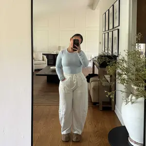 ·Features: Barrel leg pant featuring a mid-rise elasticated waistband, drawstring tie and front pockets, seam detailing at the knees, relaxed fit styles
