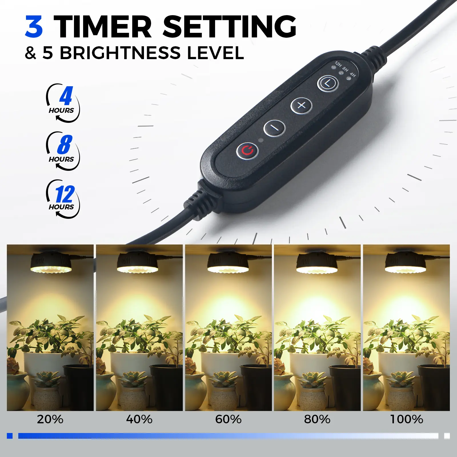 ·3 Timer Settings & 5 Brightness Levels: The Barrina grow light for indoor plants offer 3 convenient settings (4H/8H/12H) and 5 dimming levels. This functionality allows you to create the perfect lighting schedule and promote good development and maximizing yield