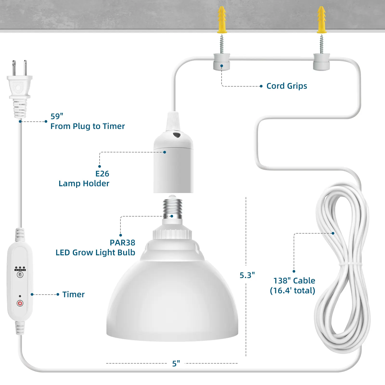 ·Timer & Pendant: Designed for easy installation and operation. Simply secure the 16.4ft power cable using cord grips for pendant. Then, plug it in and set the timer. The timer offers three functions (4H/9H/14H) and can be programmed to repeat daily