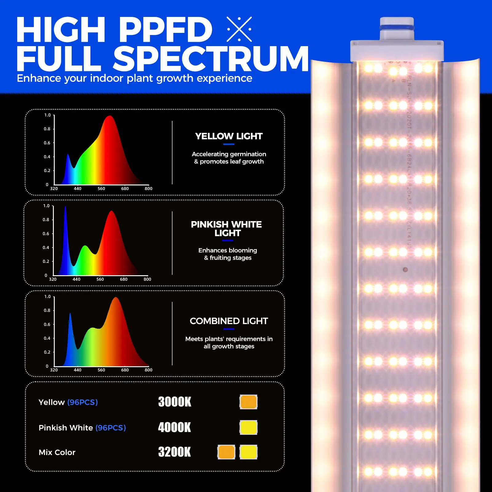 ·Full Spectrum Grow Lights: Featuring with 3 adjustable color temperatures and spectrums, these plant lights for indoor growing meet the light requirements of plants in different growth stages. Each plant light comes with reflectors to focus light effectively
