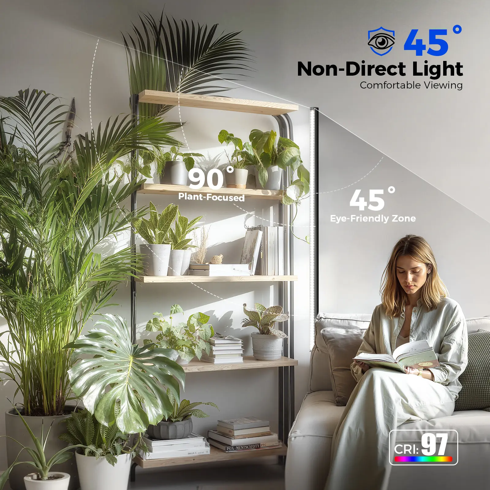 ·Low-Glare Side Illumination with CRI 97 : Designed for dual use, T1S combines functional plant lighting with comfortable brightness. Its 45° non-glare design and side illumination technology minimize eye strain when viewed from the side, while high CRI ensures color rendering—brightening living spaces without harsh glare
