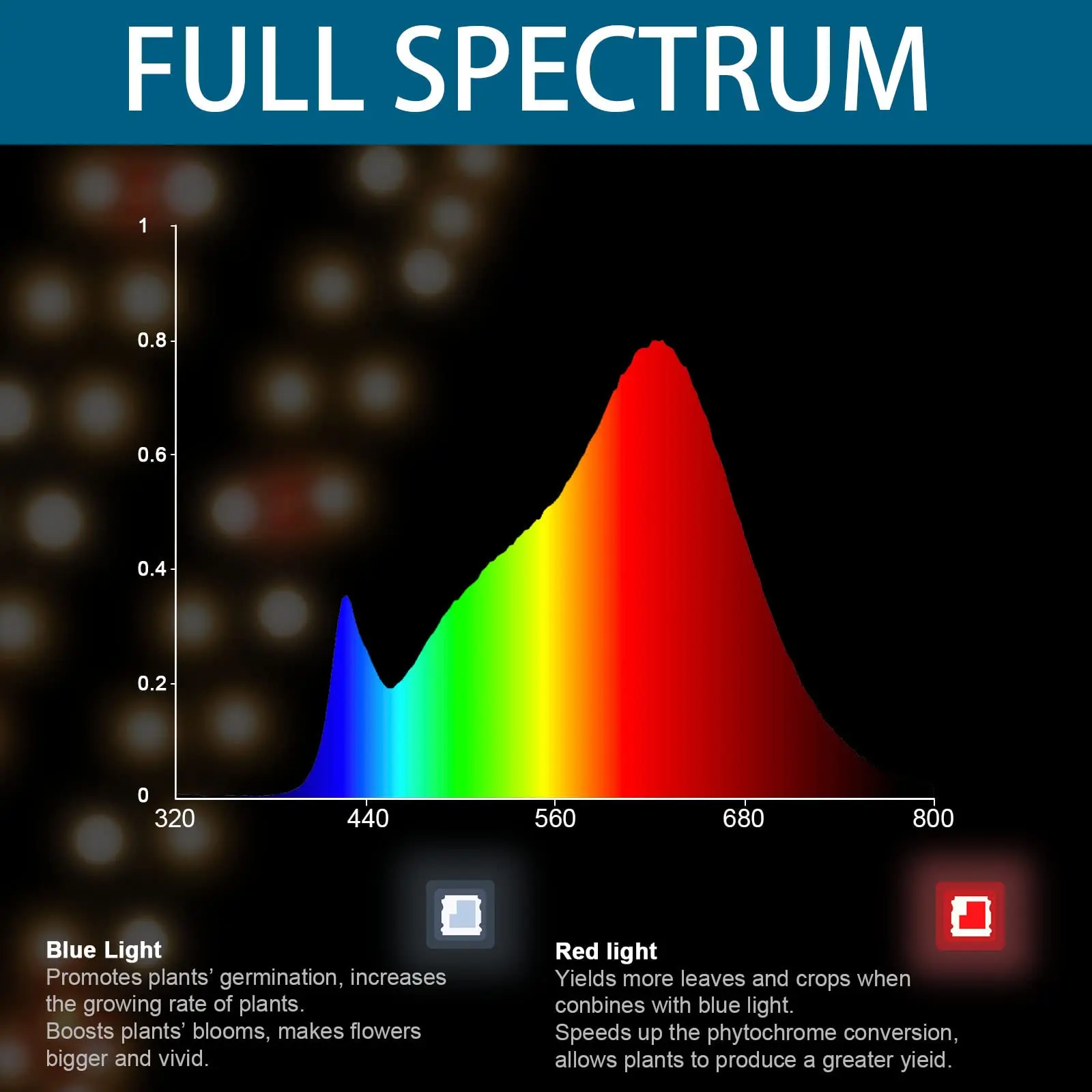 ·Super Bright and High PPFD - Consuming only 40W with 192 LEDs totally, replace 250W general plant lights. Over 95% light energy can be absorbed by plants. It is a great option for plants that in seedling, vegetative and flowering cycle