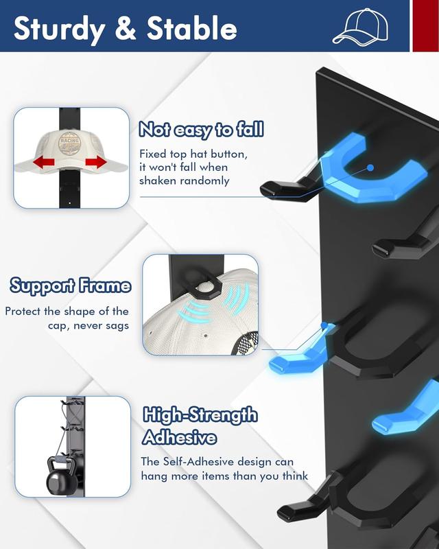 ·Installation can be done with self-adhesive or screw drilling holes. Choose the appropriate method based on the wall. For adhesive installation, press the sticker firmly for 30 seconds and wait 12 hours before hanging the hats. 📏