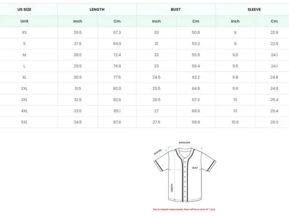 Experience the pinnacle of style, comfort, and durability with our Baseball Jersey—a winning choice for all of you. This jersey ensures superior comfort and durability, allowing peak performance on the field with its lightweight fabric. Unlike standard printed trims, our borders are carefully sewn, providing a more authentic and durable finish Featuring a classic button-up design, our jersey adds a touch of sophistication while ensuring easy ventilation during intense moments. Sizing Note: Follow the provided measurements in my size charts closely, as they differ from US and EU sizing. Sizes may vary by one size, and the fit might differ slightly depending on individual body shapes. In use: Perform a machine wash using warm or cold water (not exceeding 45 degrees). Avoid using bleach. Refrain from dry cleaning.