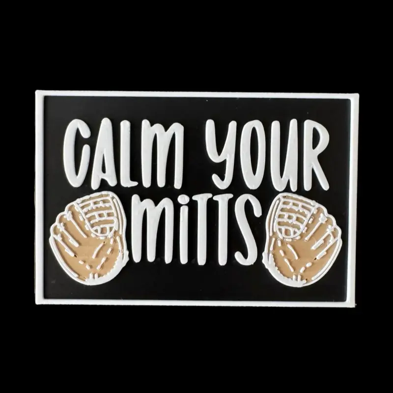 2”x3” Calm Your Mitts with Velcro bag / tote patch with adhesive Velcro hook piece on back to stick to bags with loop pieces