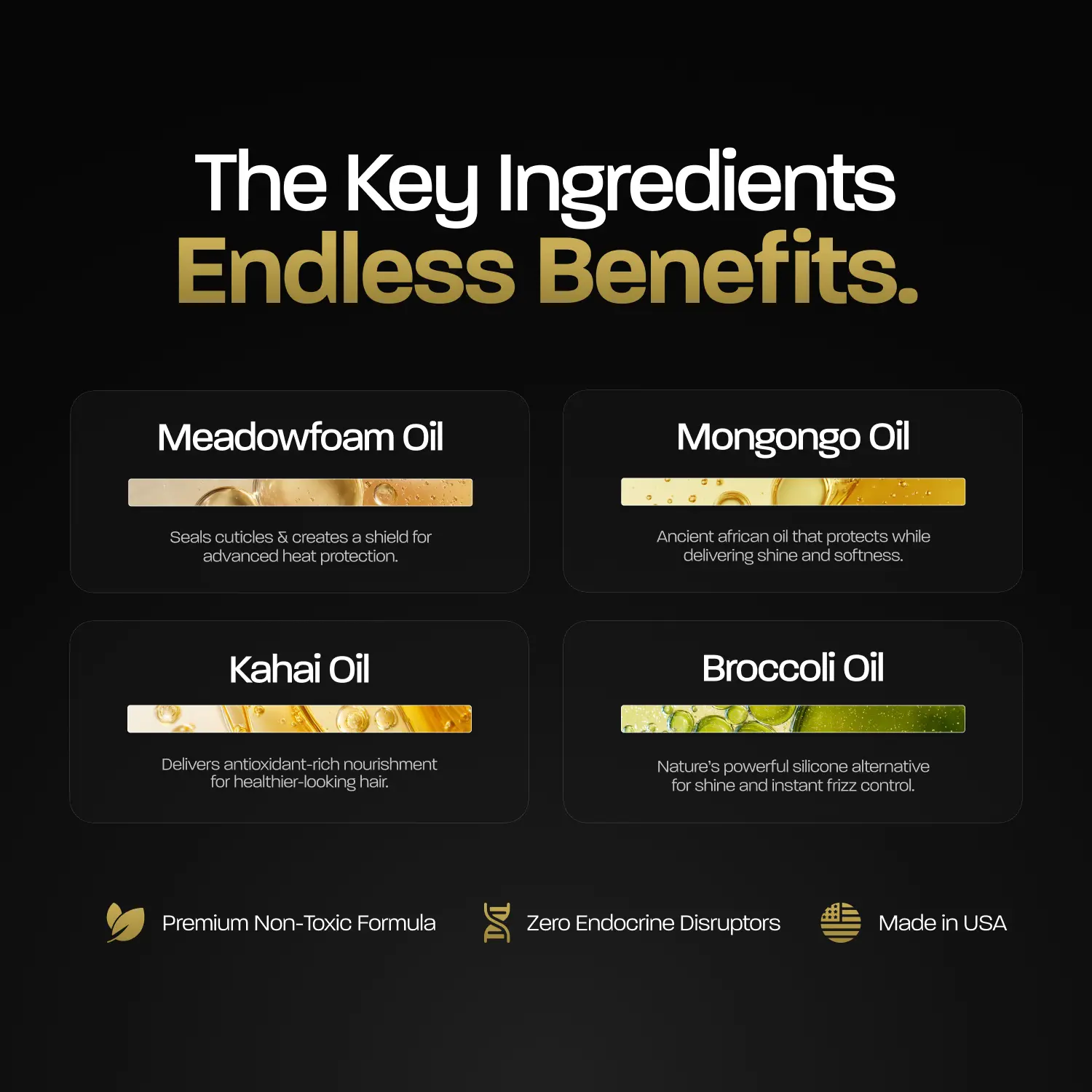 ·Premium, Non-Toxic Ingredients: Powered by Meadowfoam Oil, Mongongo Oil, Kahai Oil, and Broccoli Oil — to help protect, add shine, control frizz, and healthier-looking hair.