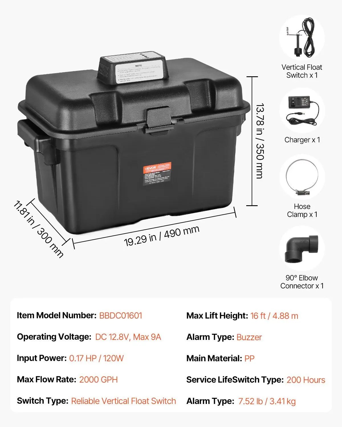Our sump pump backup system comes fully equipped.It automatically monitors water levels and triggers an alarm when anomalies are detected.The high-speed copper motor delivers an impressive 2000 GPH flow rate.In emergencies, the pump activates automatically to quickly remove excess water.