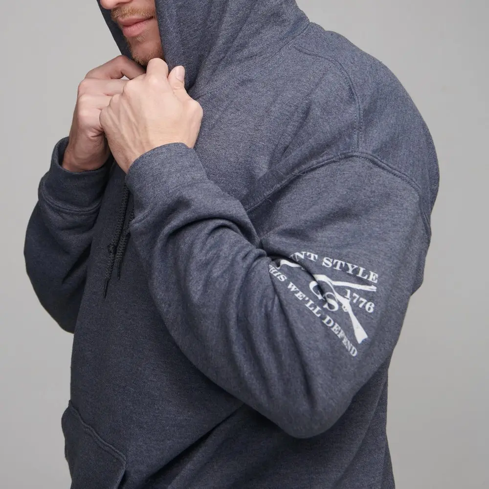 Stay warm, comfortable, and stylish with the Grunt Style Basic Hoodie in Dark Heather Gray. This hoodie may be basic, but it’s anything but boring. Featuring the iconic Grunt Style logo on one sleeve and the assaulting American flag on the other, it adds a touch of boldness to a classic design. Made from a premium cotton-polyester blend, it ensures comfort and durability throughout the day. It’s the perfect everyday essential for those who appreciate quality, comfort, and a sense of patriotism.