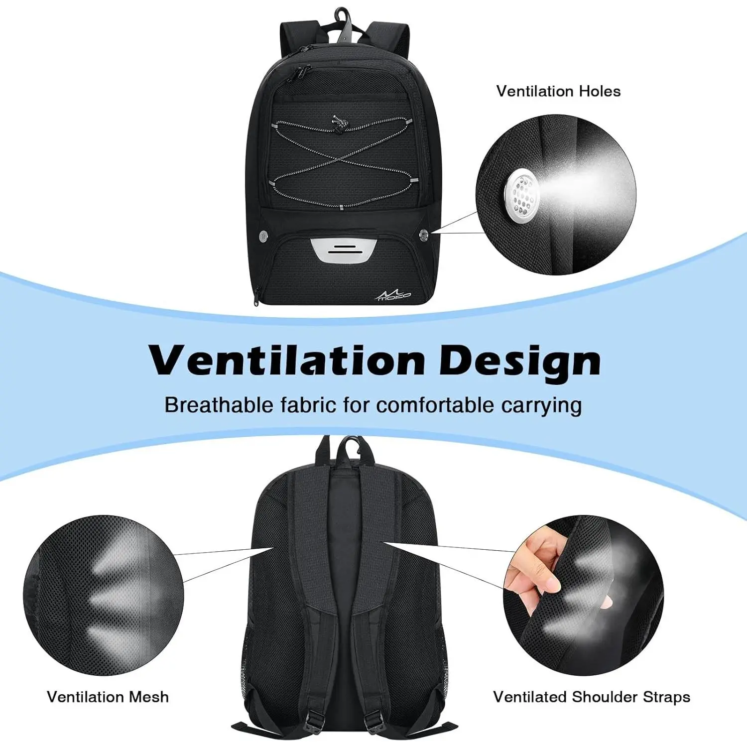 The backpack features an independent, ventilated shoe compartment with breathable holes to prevent odors. It fits men’s shoes up to US size 15 (EU 49/UK 14) and keeps dirty shoes separate from other items