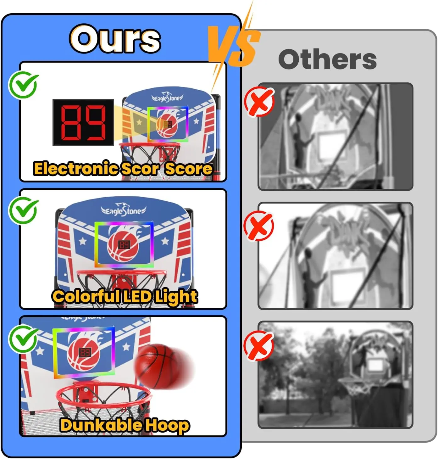 ·【Electronic Scoring & Vibrant LED Lights】 Experience the ultimate indoor basketball fun! Our indoor basketball stand features an electronic scoring system. Vibrant LED lights glow in the dark to add excitement to your game. Cheer sound effects There will be cheers every time you score, making you feel like you are in the real court. Whether you are practicing alone or competing with friends, this basketball stand can bring endless fun. Make every shot full of passion and applause!