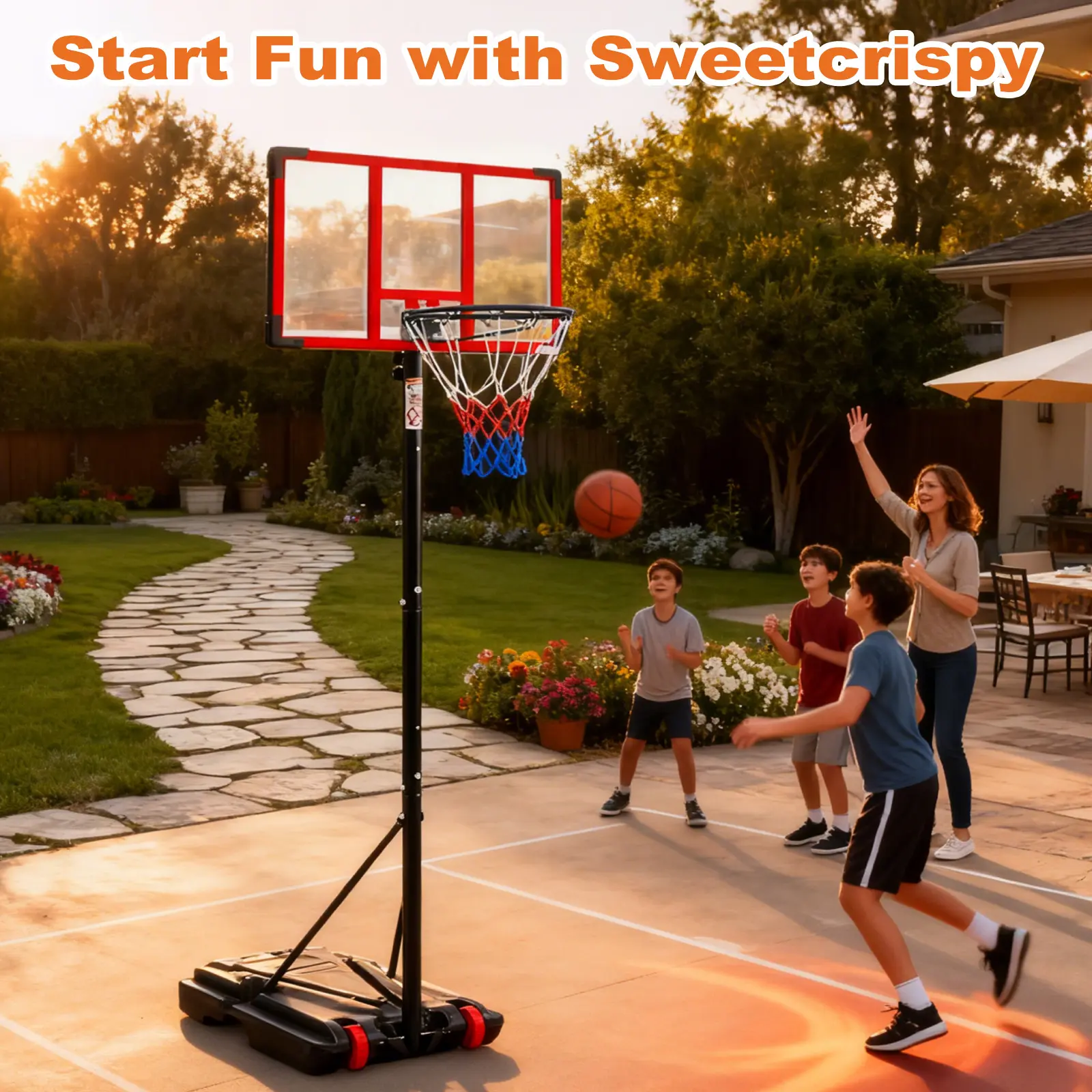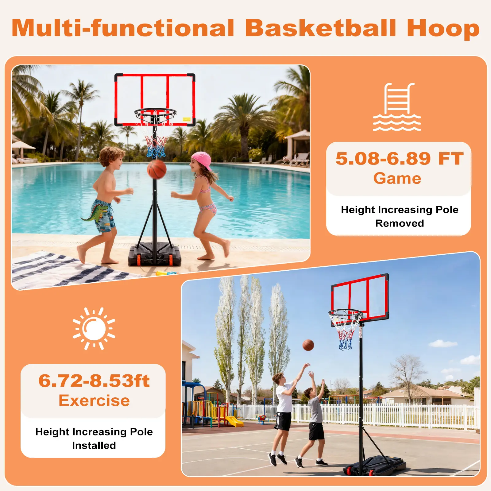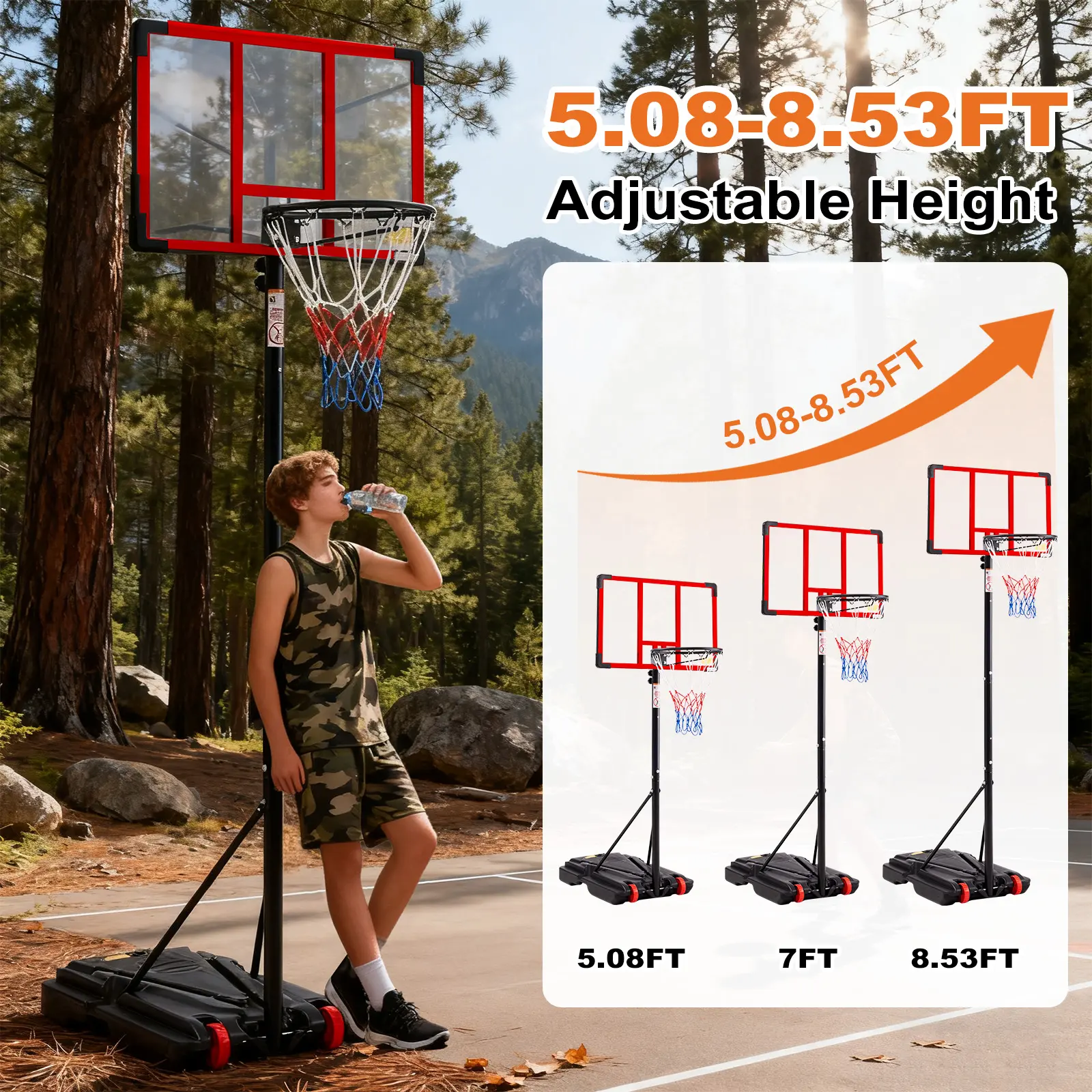 ·IDEAL BASKETBALL HOOPS - The Basketball Hoop is perfect for both indoor and outdoor use. It ' s a portable and adjustable system that can be utilized by different ages, with height adjustment from 5.08 feet to 8.53 feet