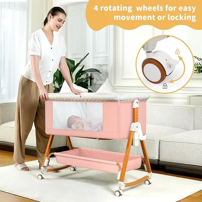 ·MAKE PARENTING EASIER: Our baby bassinet is equipped with four silent wheels with brakes for easy movement, and an integrated mosquito net to prevent insects from entering. The mattress has a moderate hardness, making the baby feel comfortable.It also features a large storage basket for baby essentials.Product Dimension: 36.22"Lx21.65"Wx31.88"H
