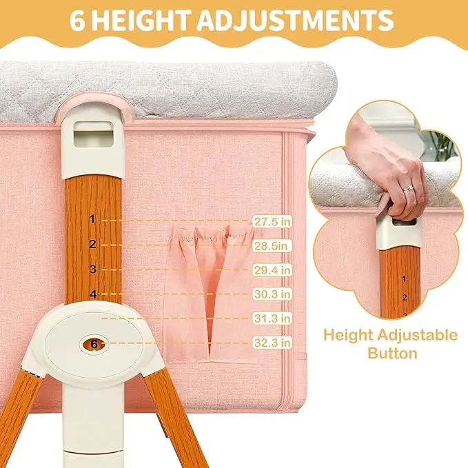 ·FLEXIBLE AND ADJUSTABLE:This bedside cradle has 6 adjustable height positions, which can be adjusted by the buttons on the sides of the cradle to accommodate different bed heights, sofas, or other usage scenarios. This way, you can easily watch over your baby and meet their needs. It can also be set to an inclined mode to prevent baby reflux.