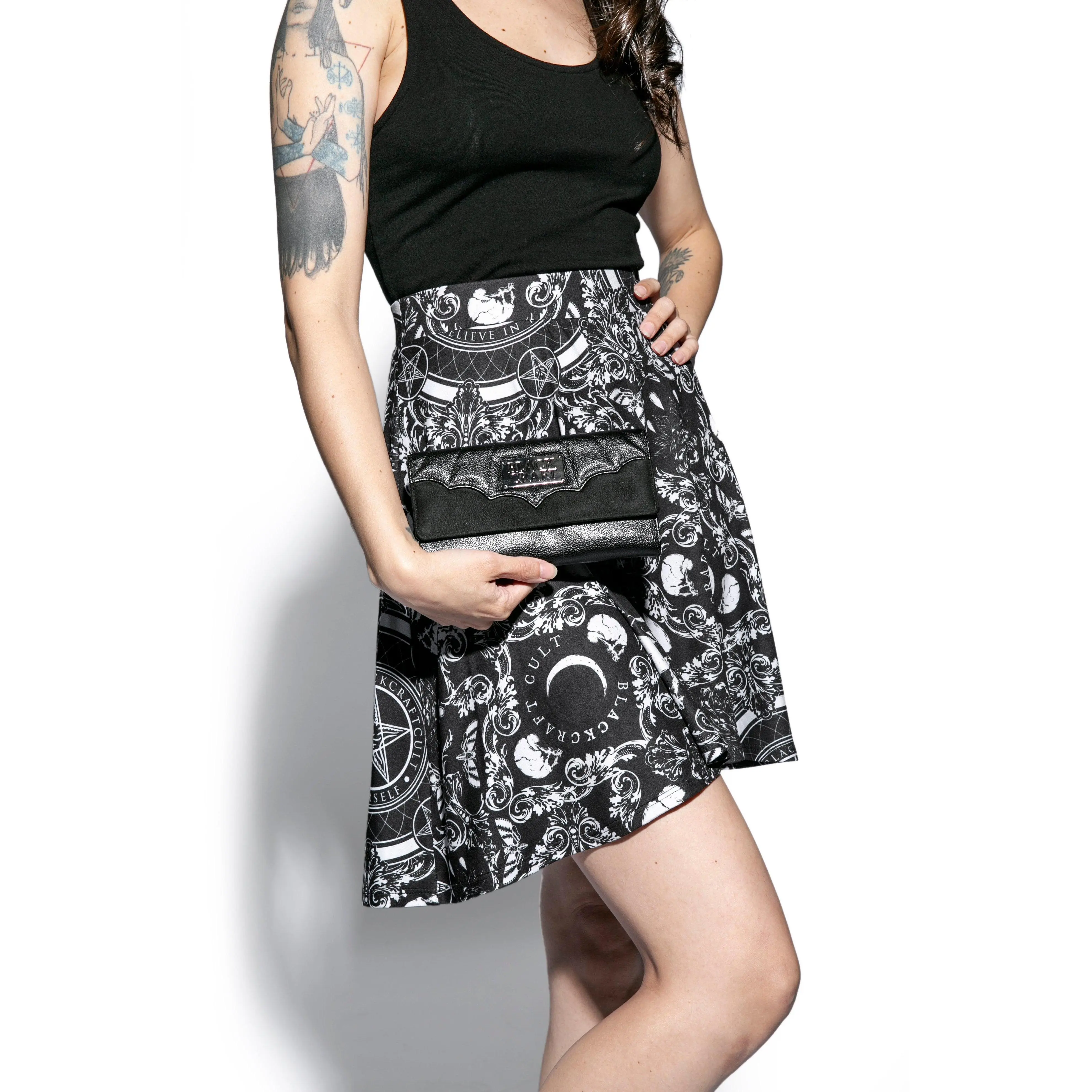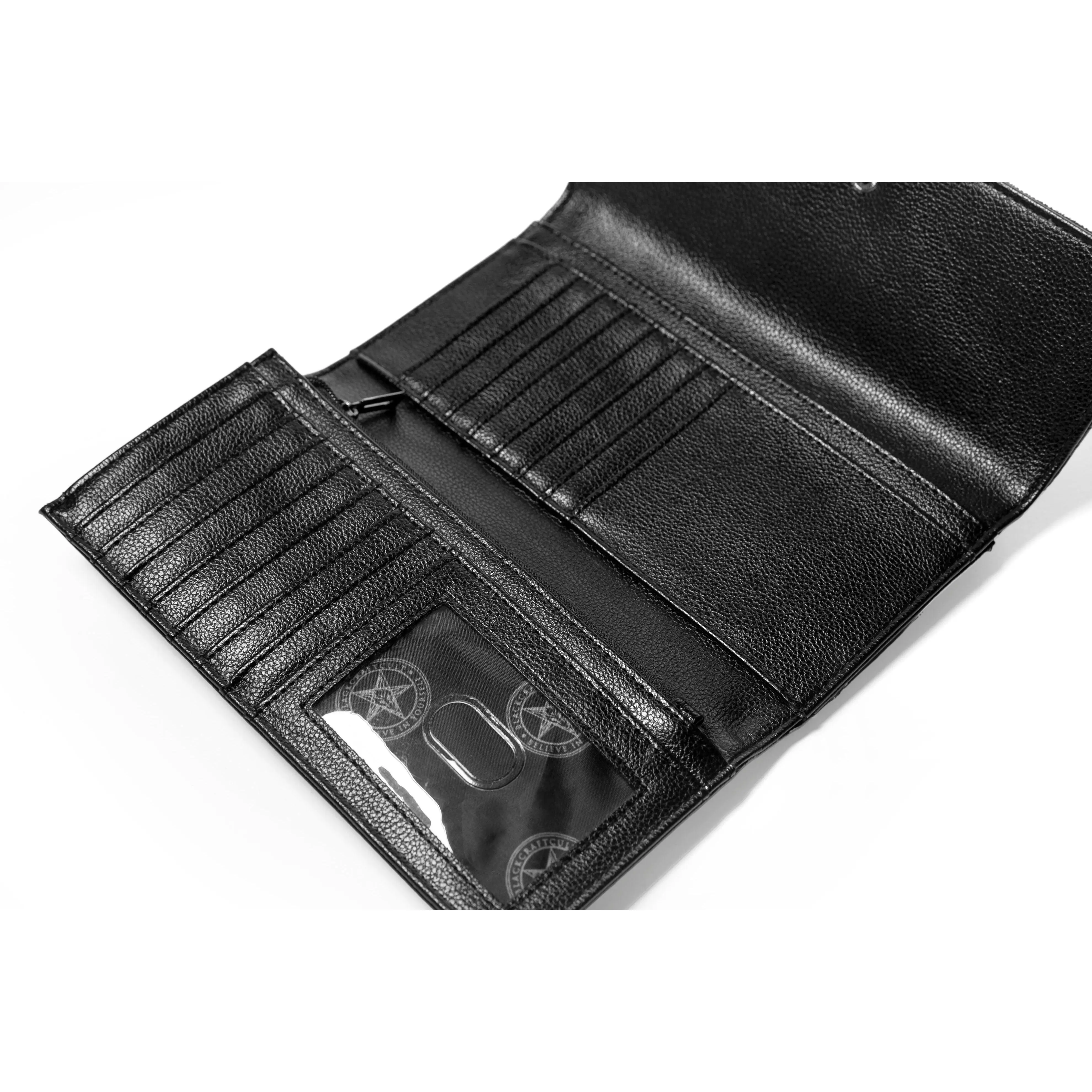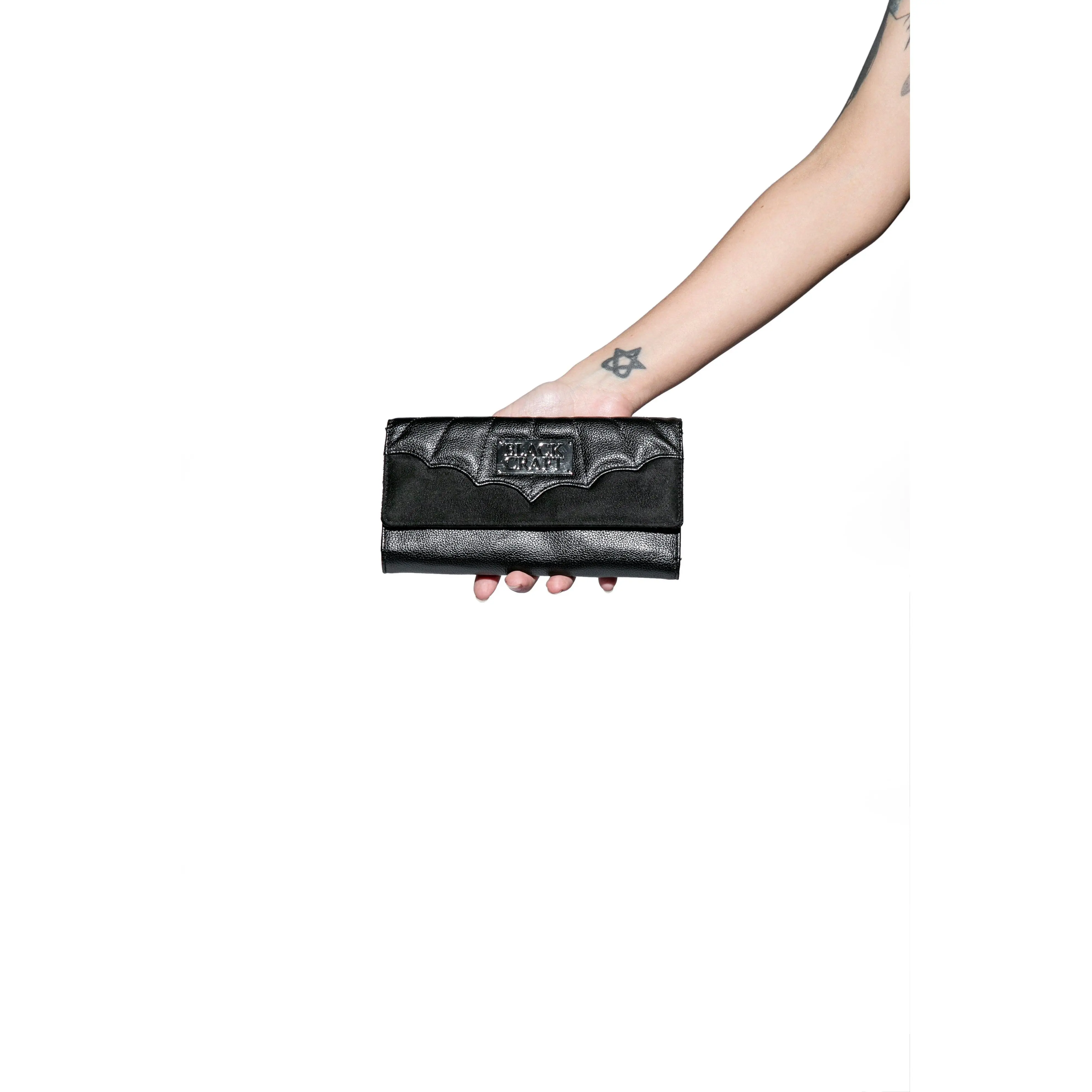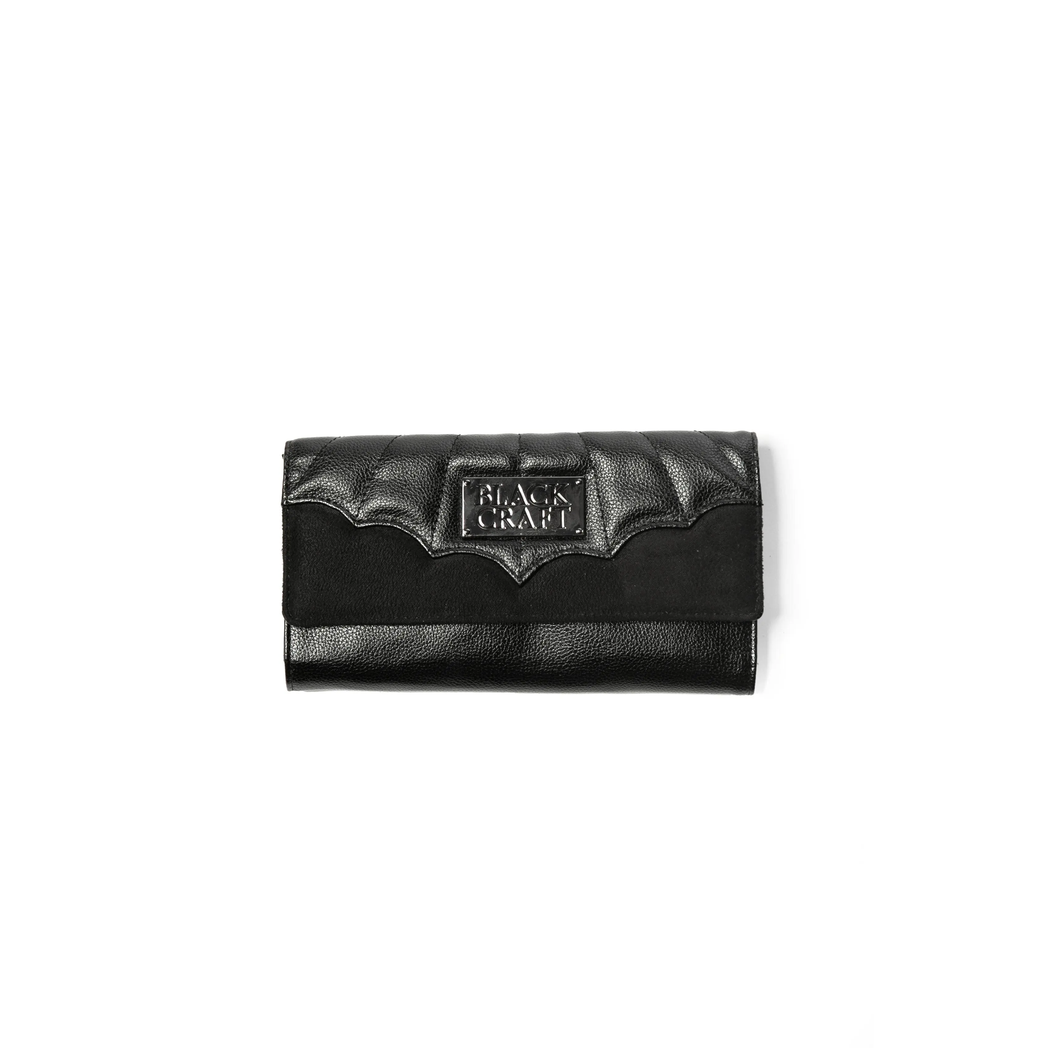 ‘Bat Wing’ - Clutch Wallet available on TikTok shop with FREE SHIPPING for a limited time only.  Faux leather wallet features bat wing detail and suede like material on front flap. Gunmetal finish zippers as well as Blackcraft logo plaque. Interior features 14 credit card slots as well as interior zipper coin compartment. Dimensions: 7.5" W x 4.5" H #wallet #clutch #blackcraftcult
