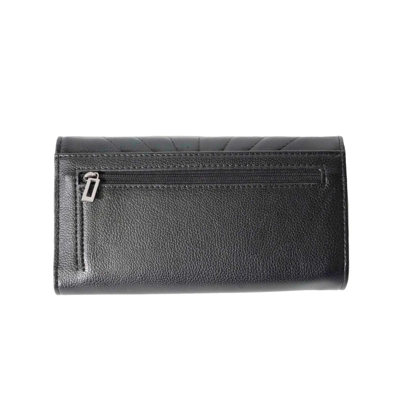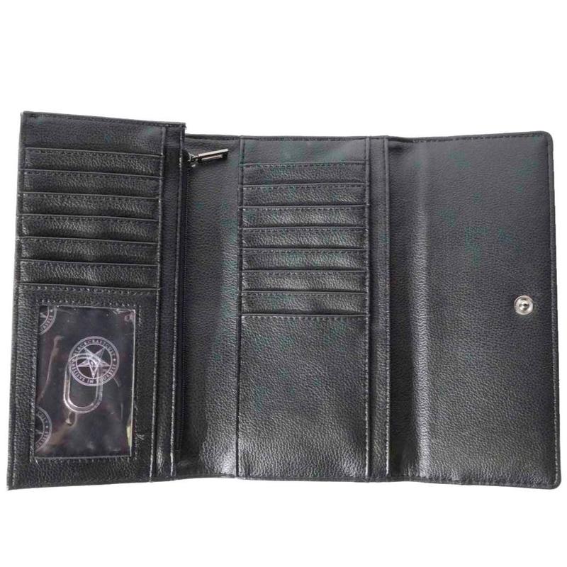 Faux leather wallet features bat wing detail and suede like material on front flap. Gunmetal finish zippers as well as Blackcraft logo plaque. Interior features 14 credit card slots as well as interior zipper coin compartment.