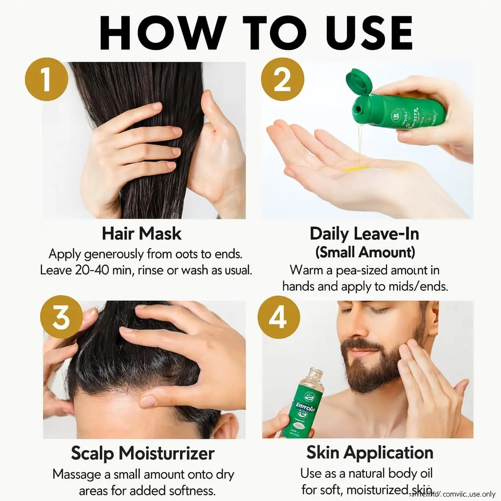 Apply 2-3 drops daily onto hair and scalp. Massage gently, let it absorb. Avoid drying it right after application. For best results, leave it overnight. Follow these steps for healthier hair.