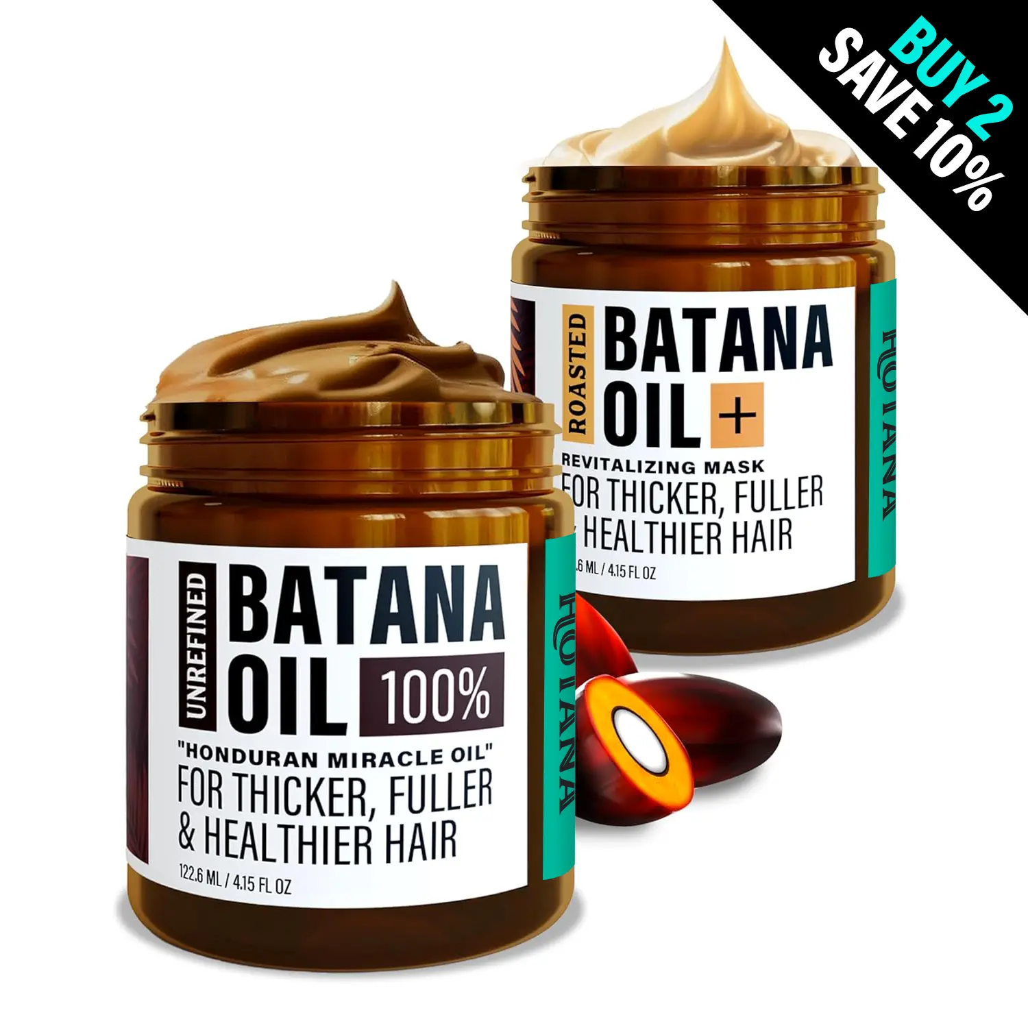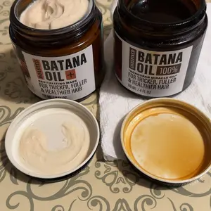 ·Texture:Batana oil: thick and creamy when solid, melts to oil upon warming, slightly grainy.Roasted batana oil + hair mask: rich, creamy, and easy to apply.