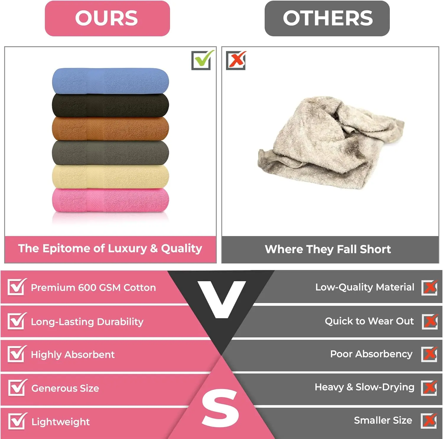 Great bath towels. Way better than I expected. Very satisfied with my purchase and I am going to get more.I have all of the towels stacked on one unfolded in my puc.