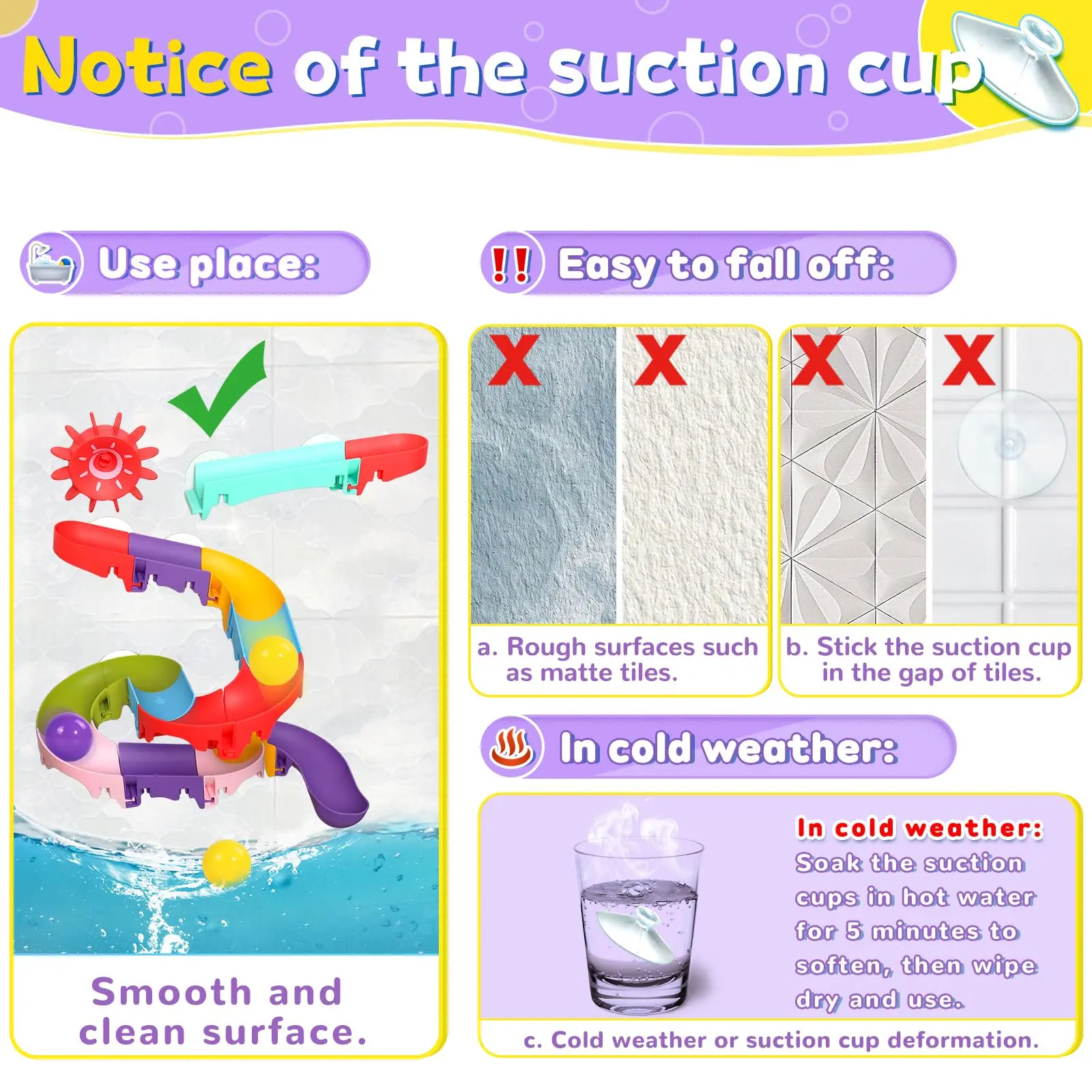 ·Suction Cups: The suction cups are designed to adhere well on smooth and clean surfaces, but please do not use them on non-smooth flat surfaces such as matte tiles.