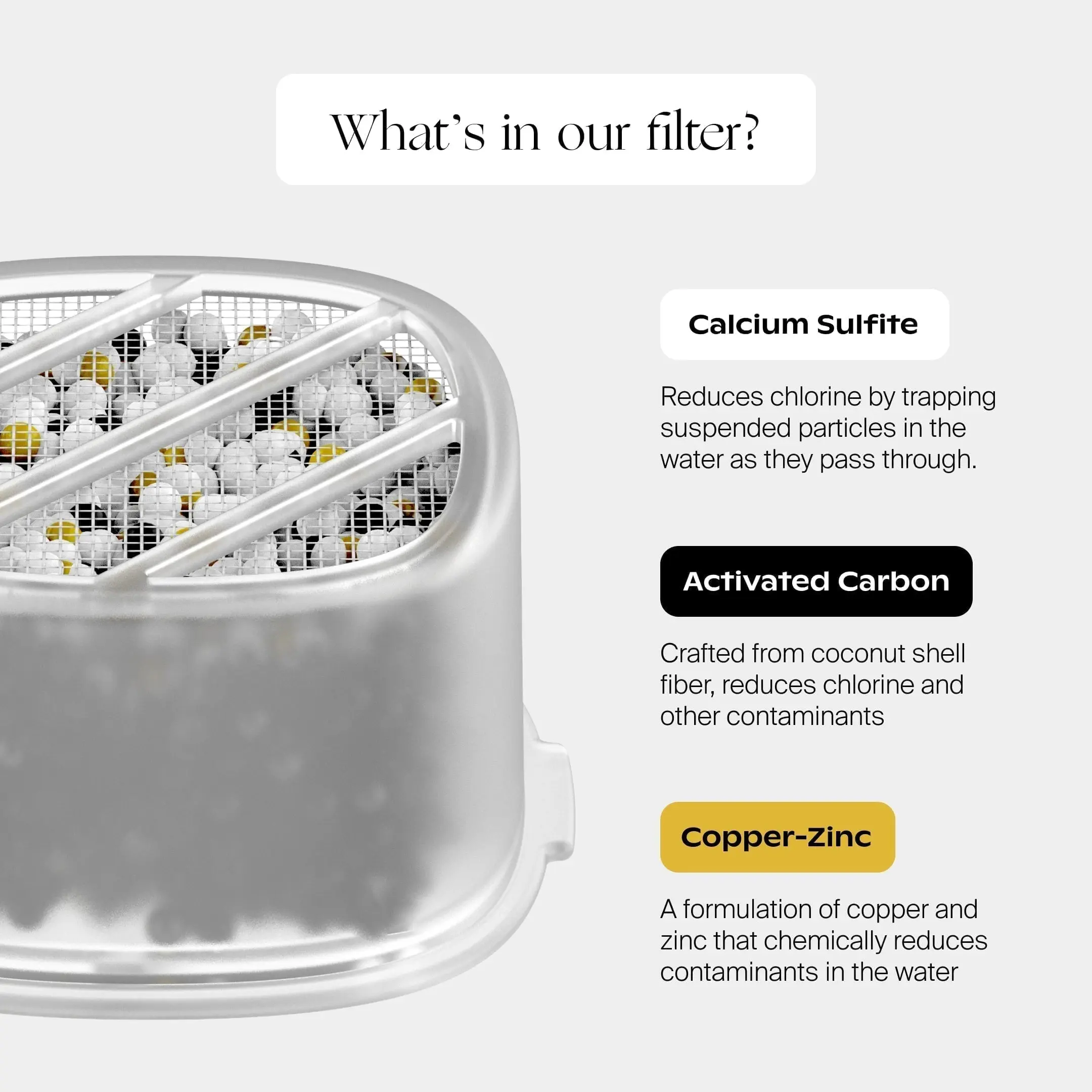 ·3 types of filtering media: granular activated carbon, copper-zinc, calcium sulfite