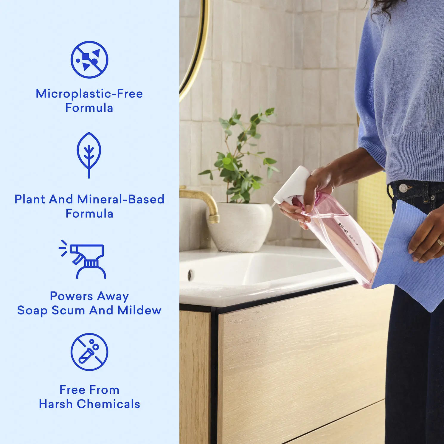 Transform your bathroom into a clean, fresh oasis with Blueland’s Bathroom Cleaner Starter Set. Made with powerful mineral & plant-based ingredients, this cleaner washes away soap scum and grime without harsh chemicals. Simply fill the Forever Bottle with water, drop in a tablet, and enjoy a sparkling clean bathroom and planet.