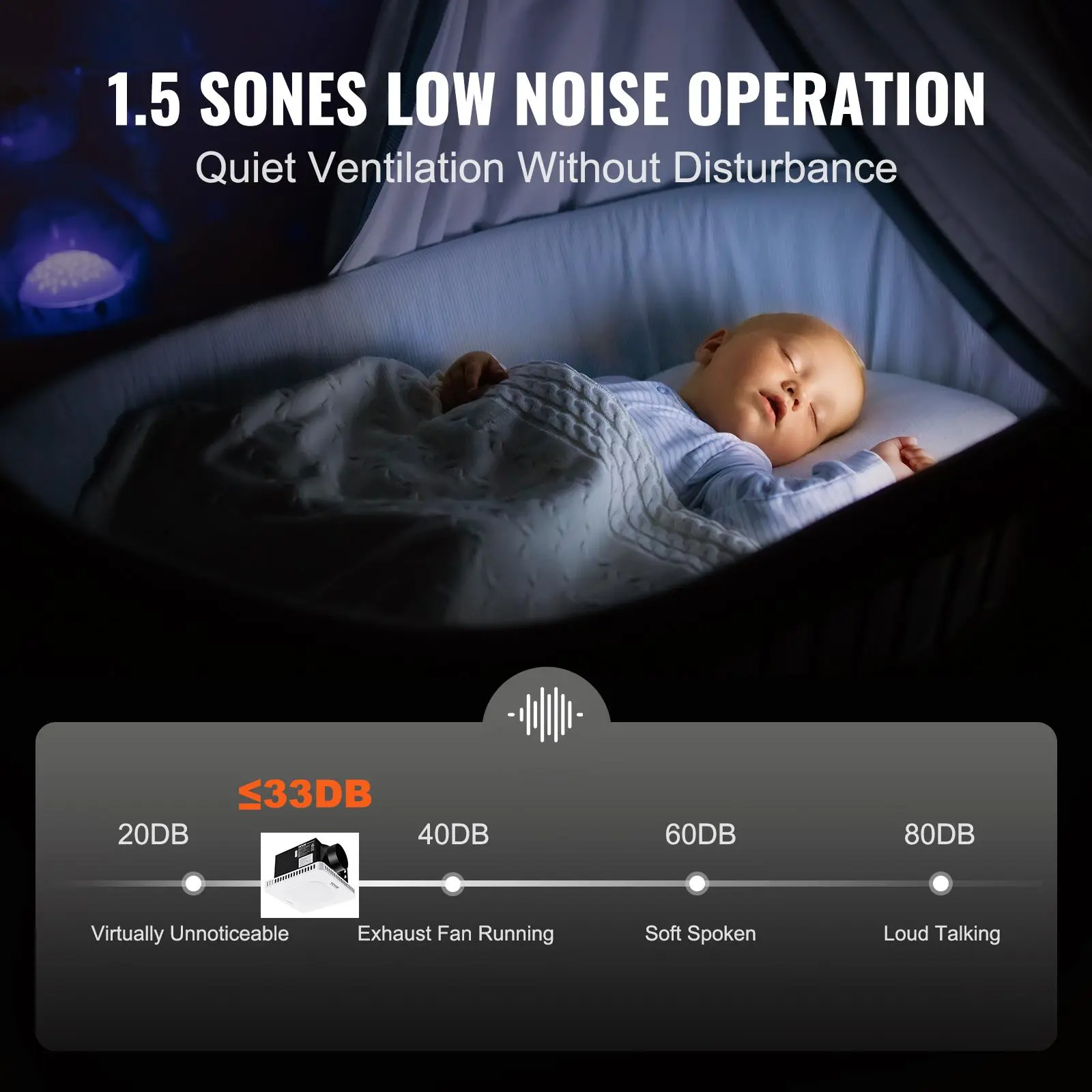 • Quiet Operation: With a quiet airflow design and a lightweight PPFR plastic impeller, this exhaust fan minimizes noise. The high-quality motor ensures stable performance, with noise levels as low as 33 decibels (1.5 sones), providing a peaceful indoor condition.