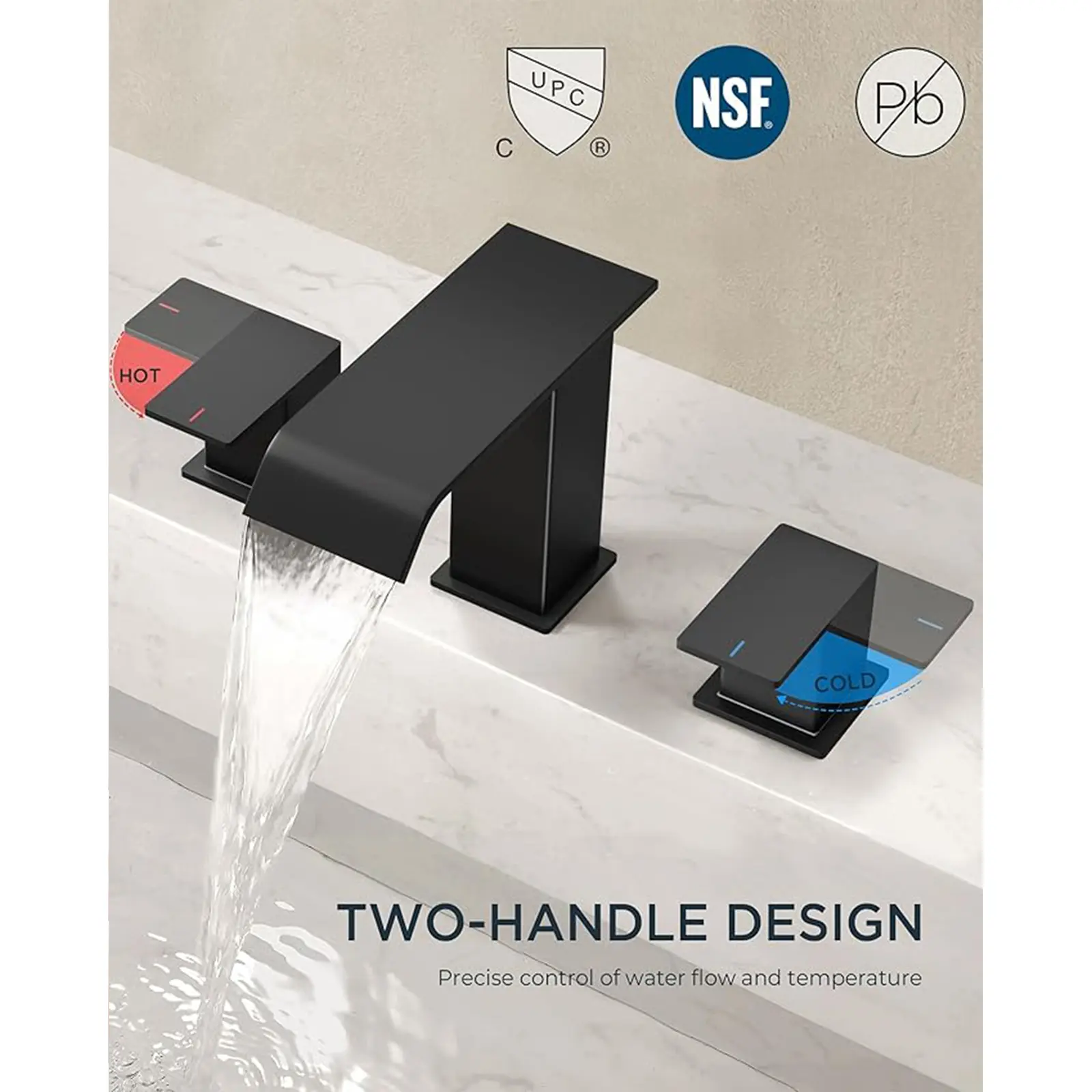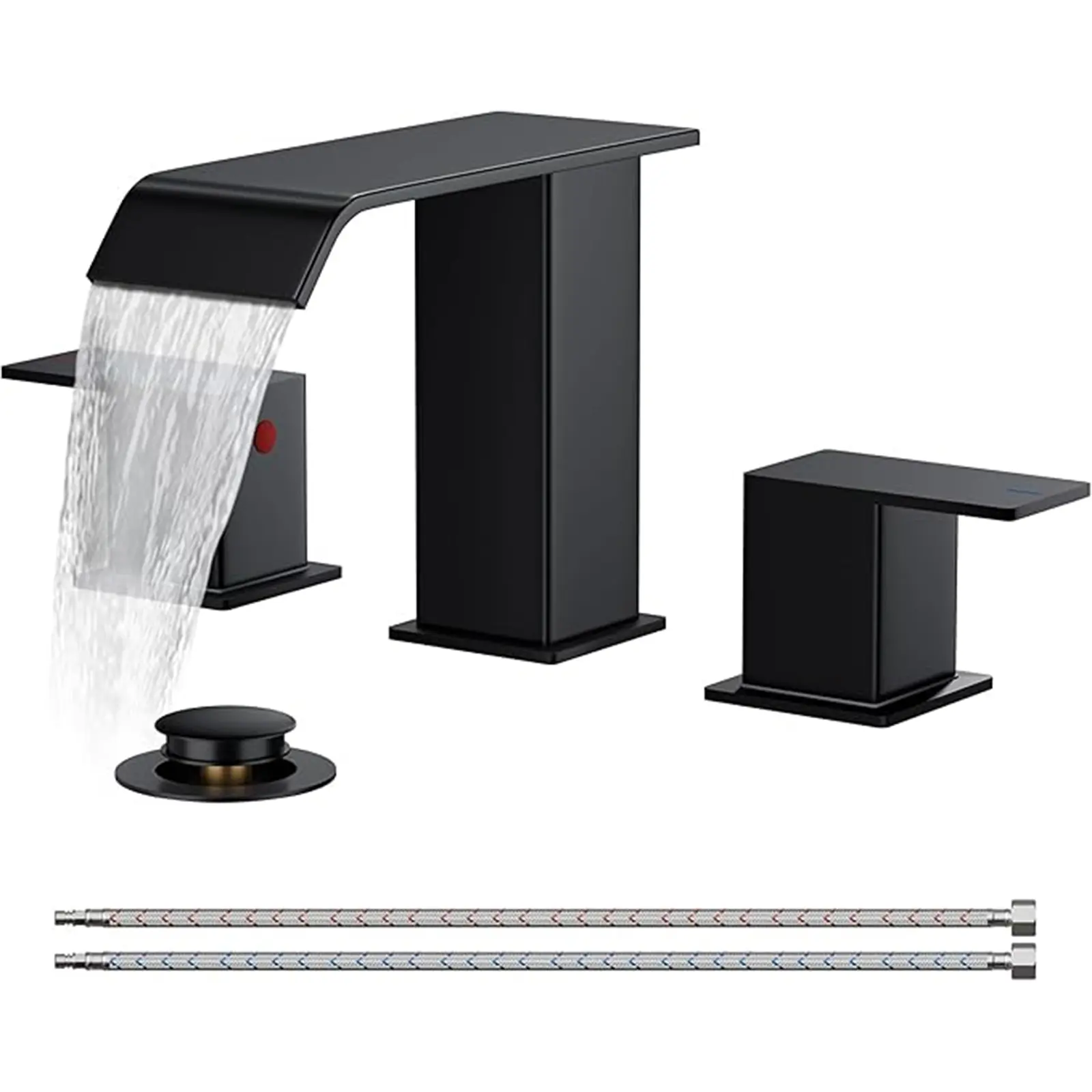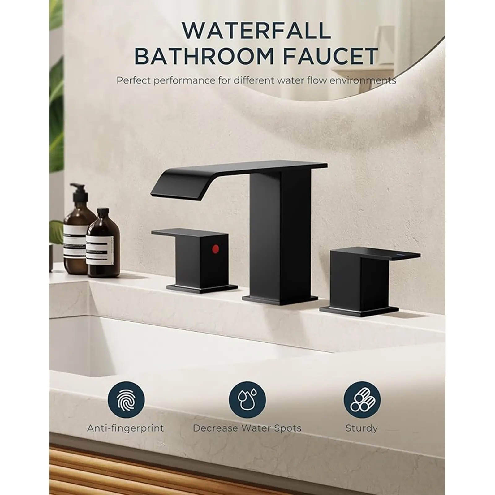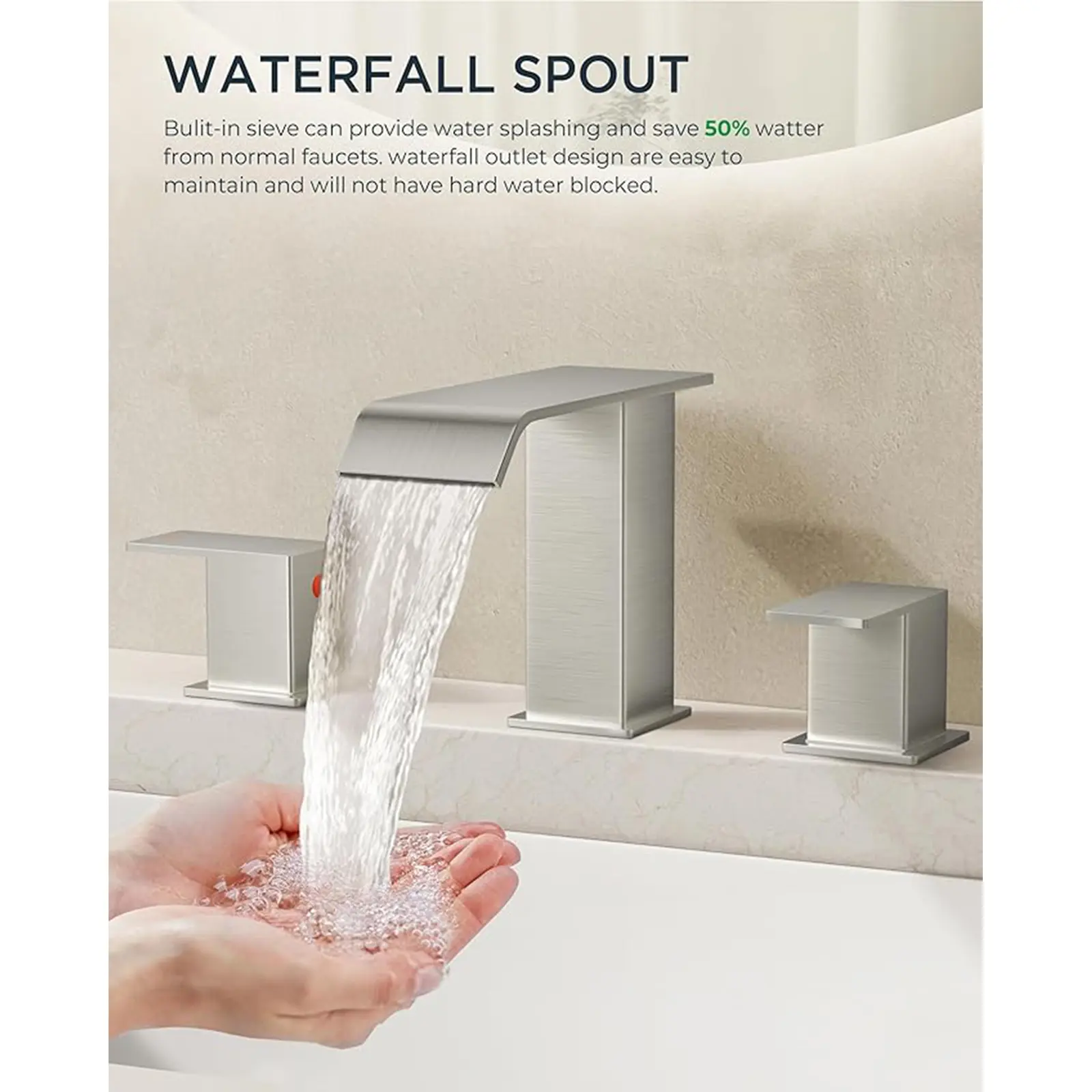 This square waterfall tap merges strength with soft beauty, embodying modern and natural aesthetics. It's designed for a 3-hole, 6-12 inch center sink, with an optimal fit for 6-10 inch centers. Please verify your sink's specifications to ensure compatibility.