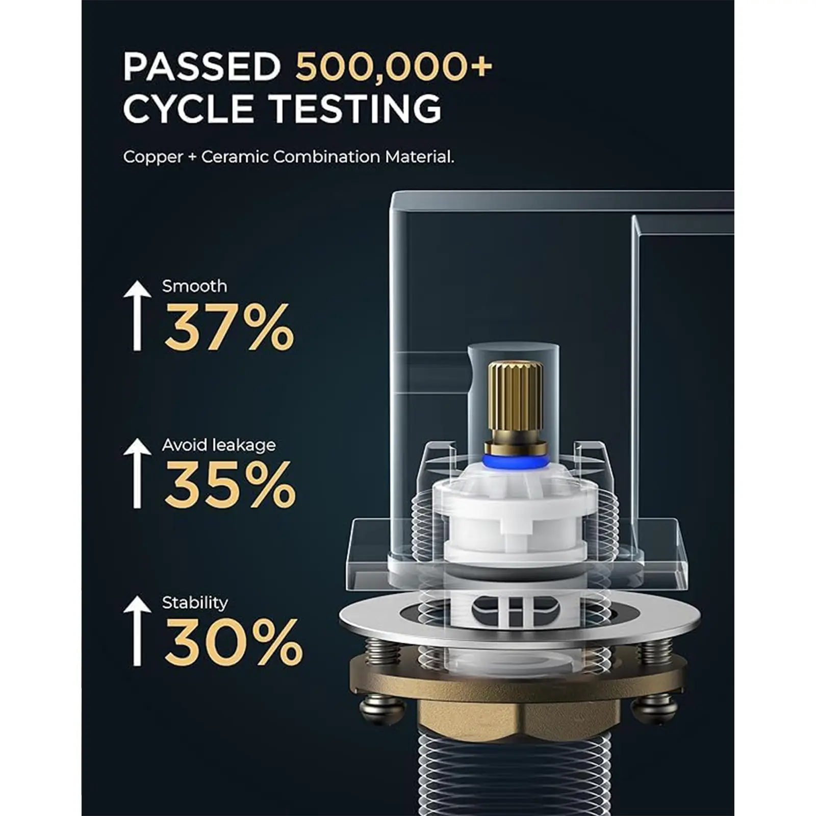 The Forious cartridge, a blend of copper and ceramic, has passed a 500,000 cycle water tightness test, ensuring high air tightness and stability under extreme temperatures and water conditions, including sand, rust, and hard water.