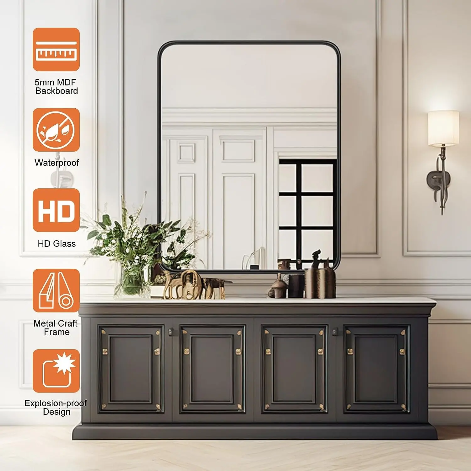 【Sturdy Metal Frame Mirror】Unlike other mirrors, The bathroom vanity mirror is adopted with 5MM tempered glass, it features shatter-proof, burst-proof, much safer to use. Ideal for use in the bathroom. Solid and sturdy, durable for use.