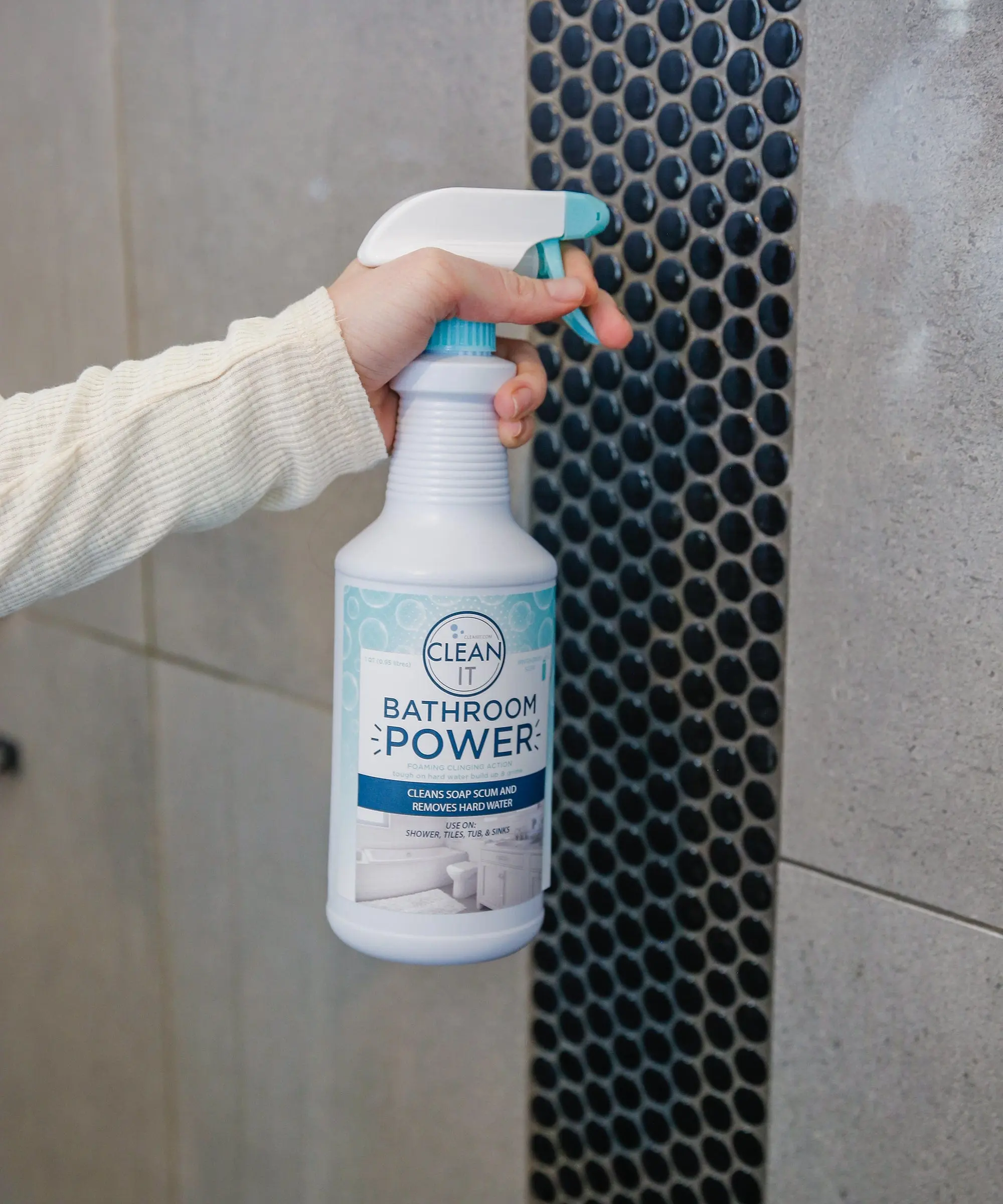 Thick foaming bathroom cleaner that cuts through soiling, soap scum, and water stains. This is a heavy-duty cleaner but does not have harsh fumes. Spray directly onto the surface and work the solution around with the Scrub & Switch tool that is included in this bundle. Get into corners and grout lines with the heavy-duty grout brush. Rinse off with cold water after a few minutes of letting it dwell and clean. Use on porcelain, ceramic, fiberglass, stainless steel, and other acid-resistant surfaces.