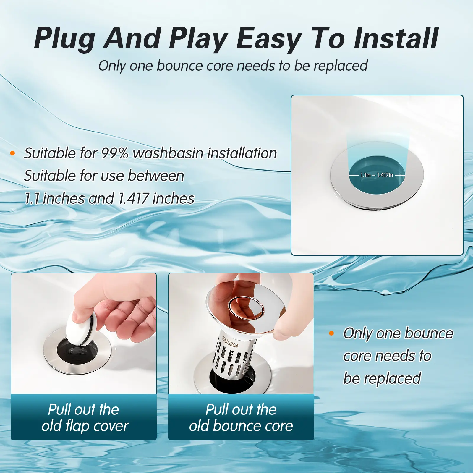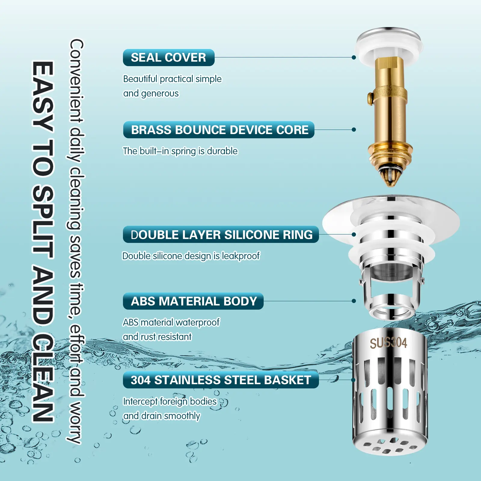 【Pop-up Design】This sink stopper is engineered to catch hair and prevent clogs in your bathroom sink. Featuring an easy-to-use pop-up mechanism, it allows for effortless opening and closing of the drain. With a diameter range of 1.1-1.45 inches, it fits most U.S. bathroom sinks and acts as an effective drain filter.