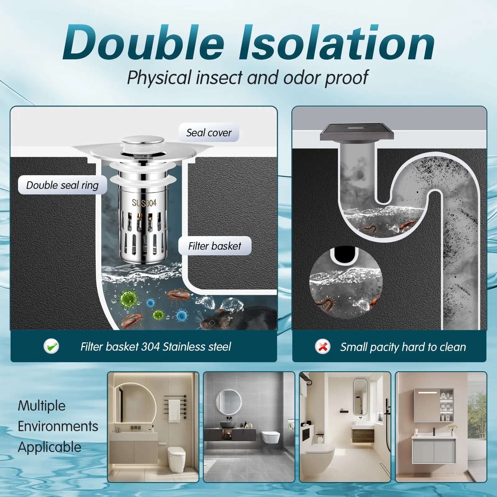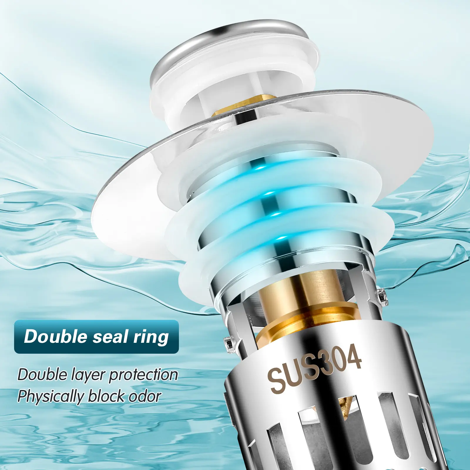 【Premium Material】Made from thickened premium 304 stainless steel and brass, this durable sink stopper is built to last. It has undergone rigorous durability tests, ensuring no rust and preventing water leakage for extended service life.