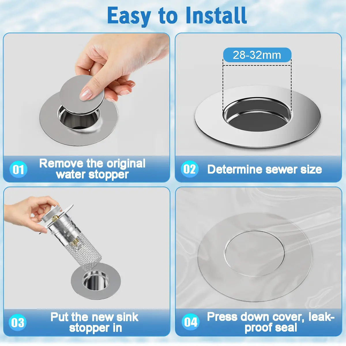 Conclusion: This bathroom sink stopper offers perfect compatibility, upgraded 2-in-1 functionality, premium and durable material, quick drainage, and simple installation. It is an ideal choice for maintaining a clean and odor-free drain.