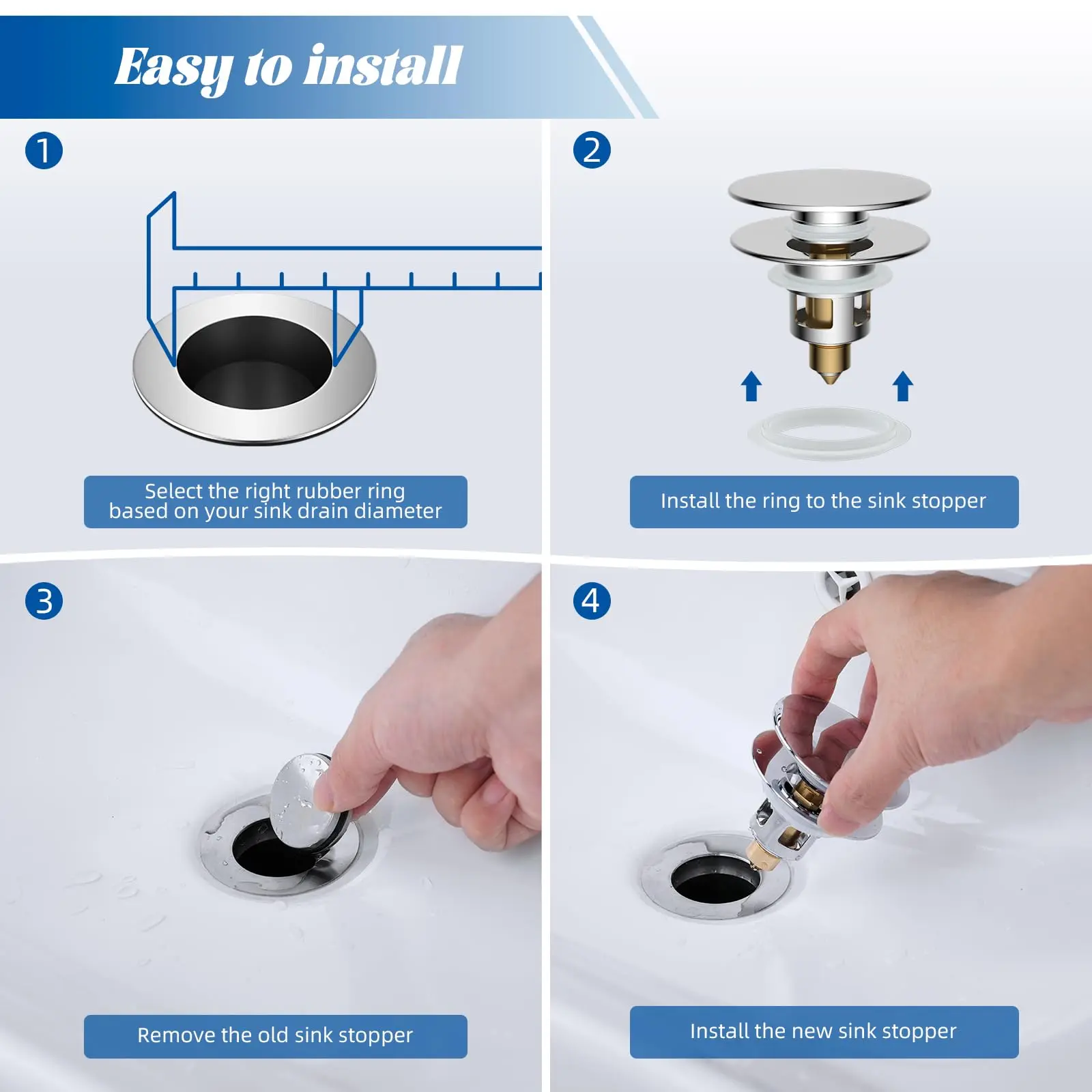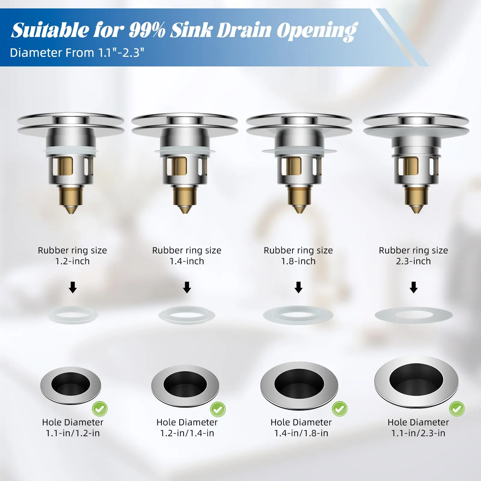 ·Versatile Compatibility: This bathroom sink drain stopper is designed to fit 99% of standard US sink drains, including bathroom sinks and washbasins with drain holes ranging from 1" to 2.3". Please measure your sink drain hole opening before purchasing to ensure a proper fit. The package also includes four O-rings while others only include 2. Which can ensure a perfect fit for various drain openings. Note: This stopper is not suitable for bathtub drains