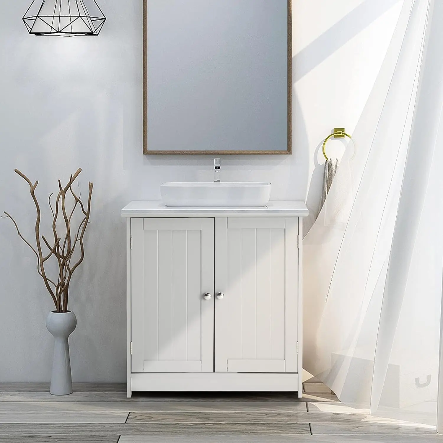 This cabinet is designed for easy installation under your sink. Its sleek white finish complements various bathroom decors. With its adjustable shelves, you can tailor the storage space to fit your requirements. Perfect for keeping your bathroom tidy and organized.