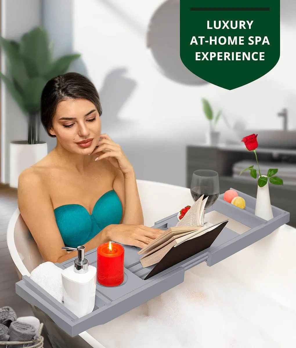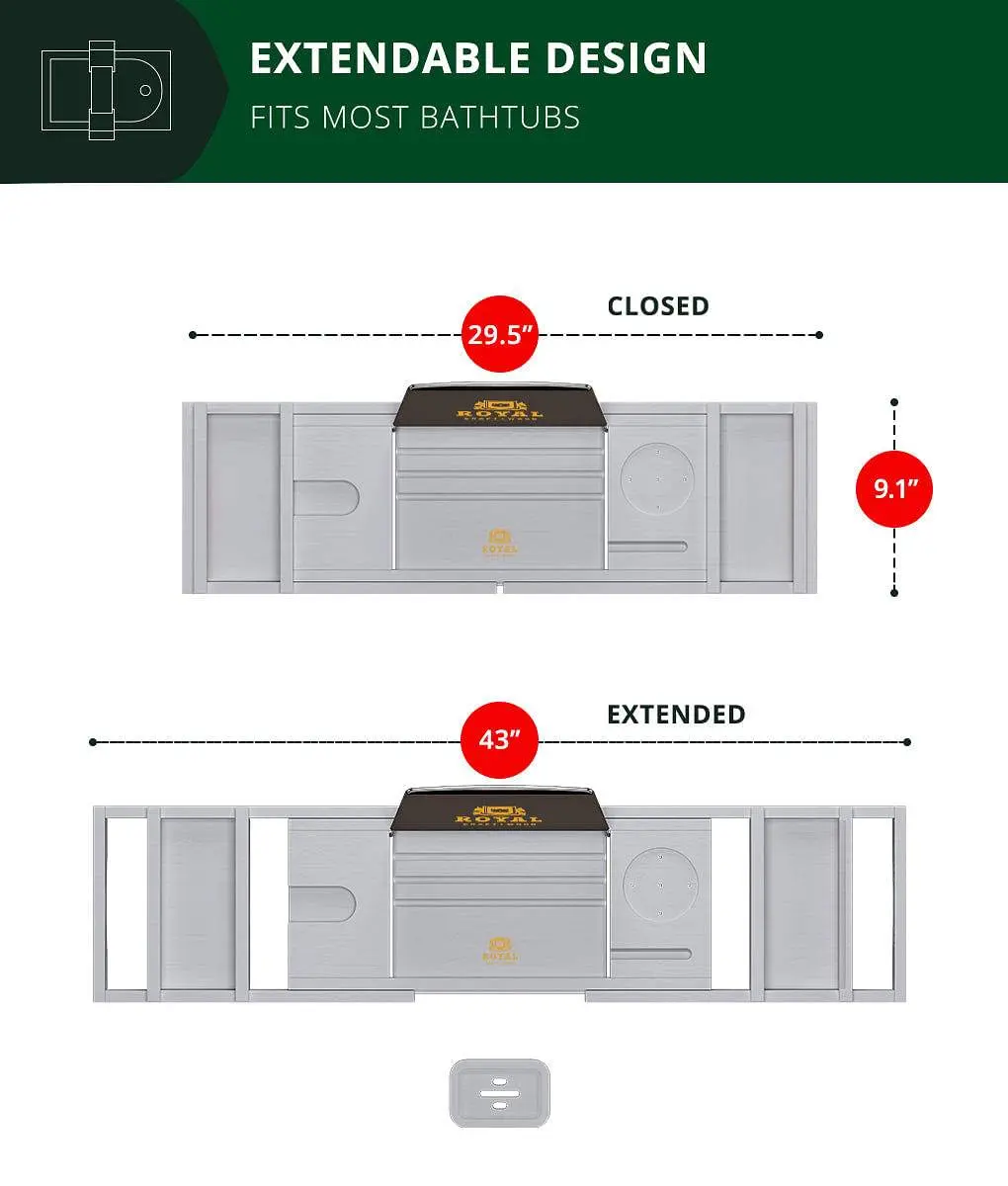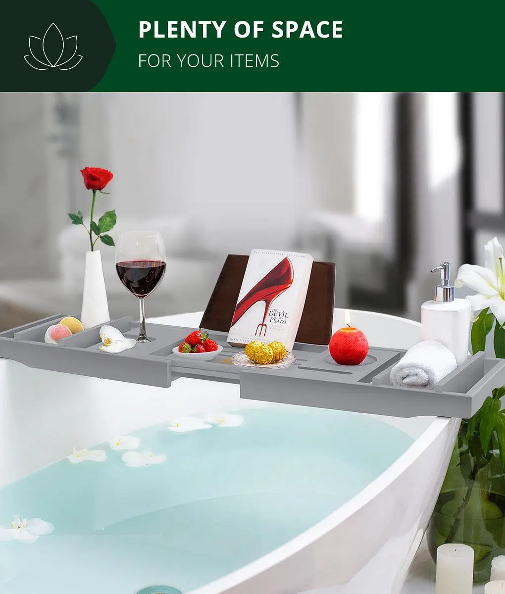 Our bathtub tray takes all the guesswork out of it so you can get straight to enjoying your next bubble bath, conveniently expanding from 29½ inches to 43 inches to fit even the widest tubs. 2 included spa trays may be attached or removed, allowing you additional room for more bathroom accessories, making it handy for when you want to enjoy a luxurious bath for two.