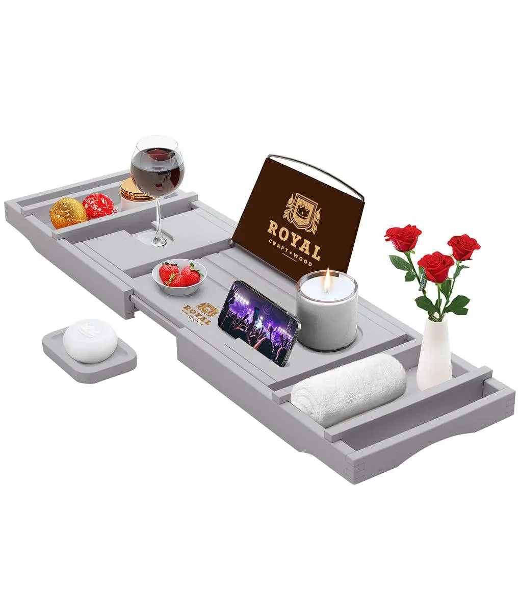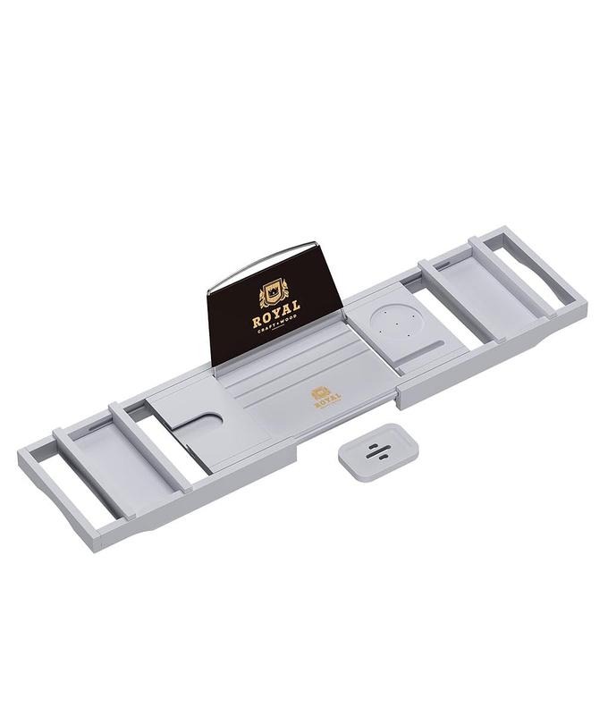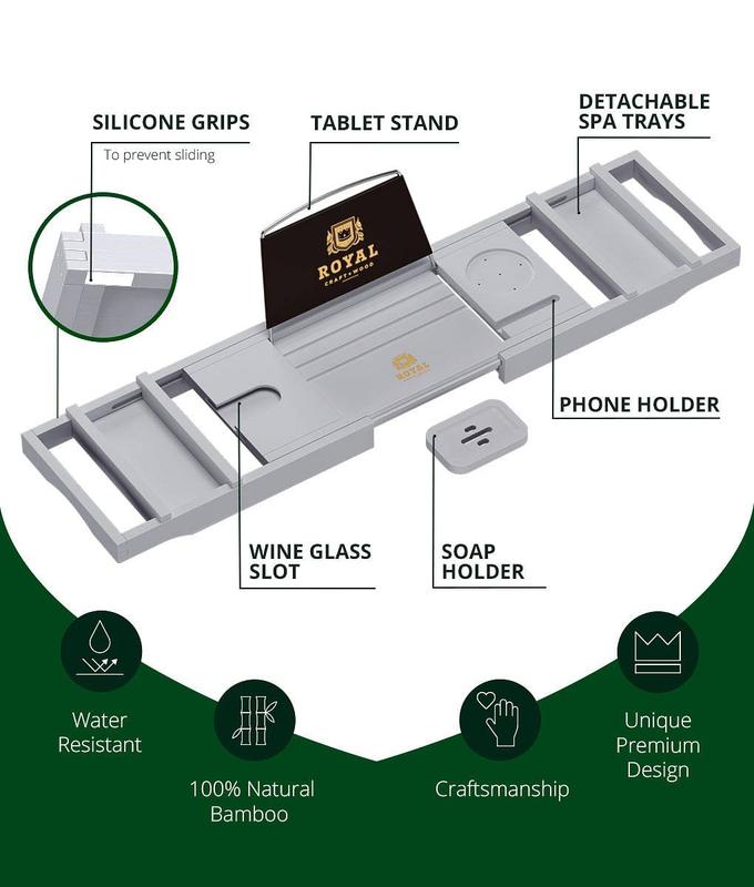 𝑺𝑳𝑰𝑷 𝑹𝑬𝑺𝑰𝑺𝑻𝑨𝑵𝑻, 𝑾𝑨𝑻𝑬𝑹 𝑹𝑬𝑺𝑰𝑺𝑻𝑨𝑵𝑻:Crafted with your peace of mind as our biggest priority, the Royal Craft Wood expandable bamboo bathtub caddy features non-slip silicone grips on its underside so it remains securely in place, without you having to worry about it tipping over and spilling your important personal items, phone, or tablet into the water.