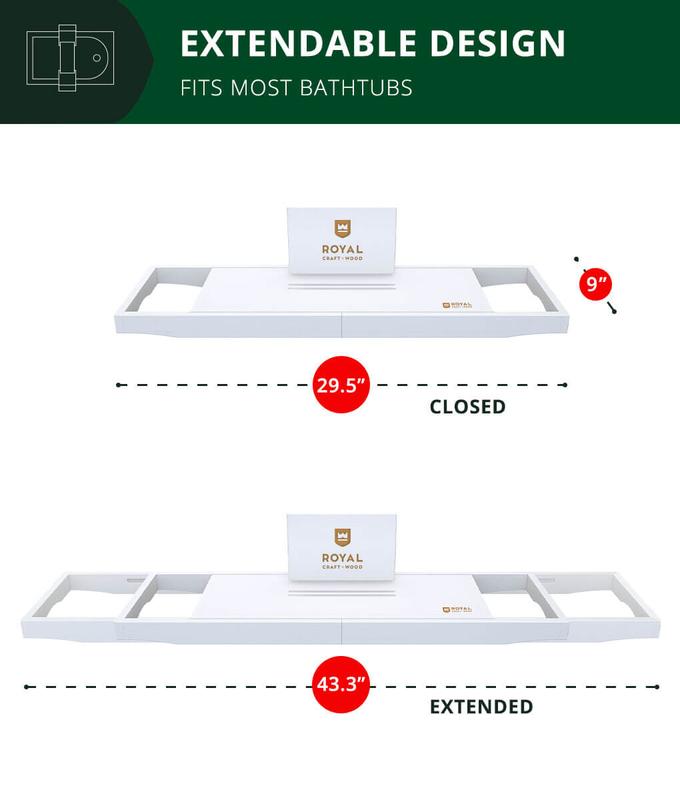 Our caddy accessory is both functional and fashionable as we’ve worked with skilled craftsmen to develop a unique and ultra-convenient layout that is certain to go well with your bathroom's aesthetic. Customize to your preferences and bathtub dimensions as it acclimates from 29 1⁄2" to 43", to make the most of your space!