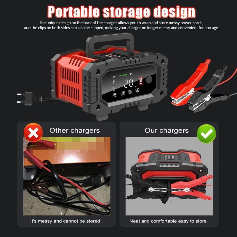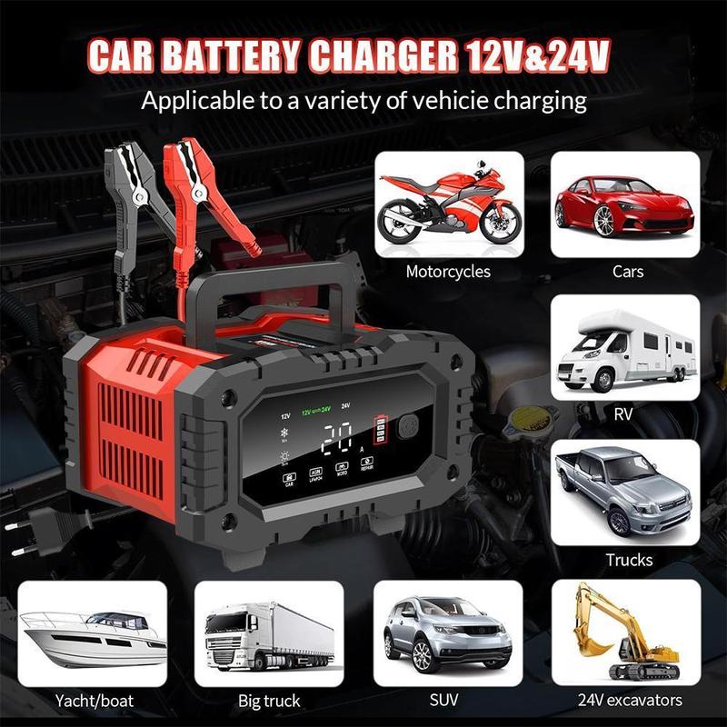 ·【3-in-1 Quick Battery Charger, Maintainer and Desulfurizer】Works as 12V or 24V battery charger, this 12V/20A and 24V/10A fully-automatic smart charger is powerful to solve various battery problems. It's the all-in-one solution battery charger, battery maintenance charger, trickle charger, plus battery desulfator. Automatically battery test, charge and maintain your loss battery for stronger engine starts and extend battery life.It is not a jump starter, only the battery charging function.