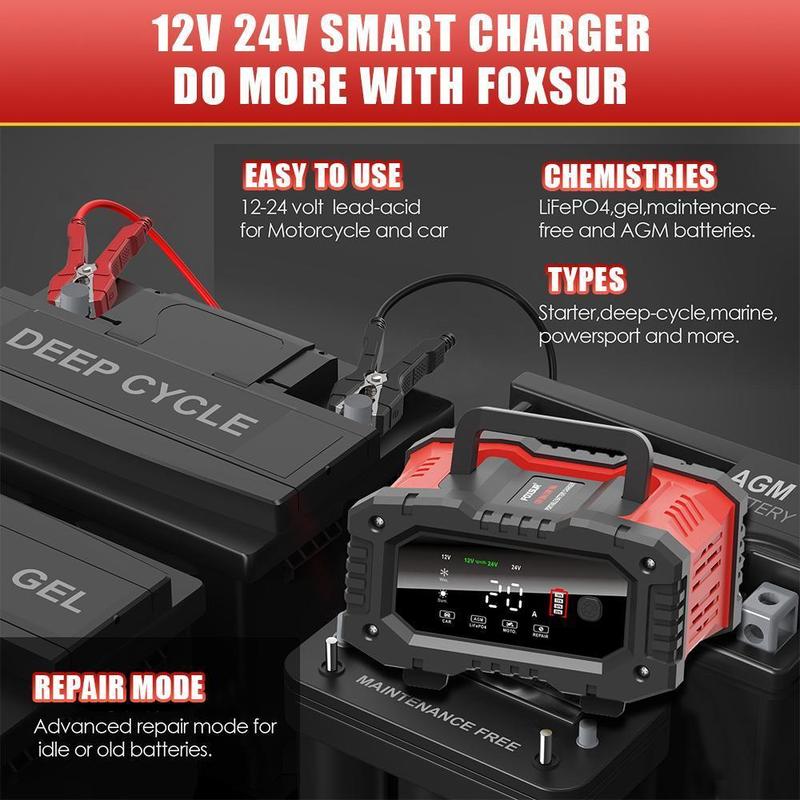 ·【Upgraded 20-Amp Quick Battery Charger】The NEW version intelligent battery tender, the charging speed is 12V@ 20Amp and 24V@ 10Amp, which is much faster than 10A or 6A automatic chargers. Designed to charge, maintain and repair all 12-volt and 24-volt lead-acid automotive, LiFePO4, marine and deep-cycle batteries including AGM,GEL,EFB,SLA,Flooded(WET),Calcium in cars, truck, SUVs, ATV, motorcycle, snowmobile, lawn mower, boat, tractor, forklift, golf cart, etc.NOTE: LITHIUM BATTERY DISABLED.